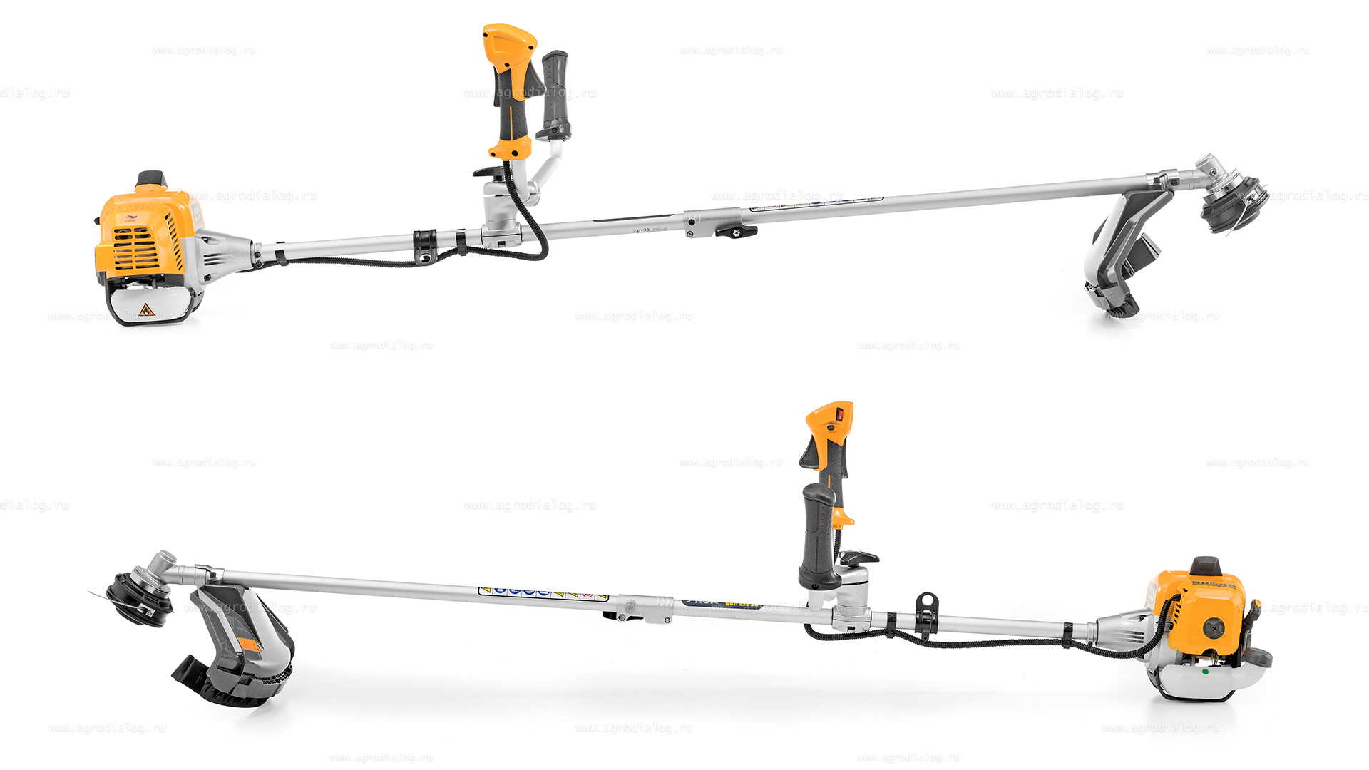 - Двуручная рукоятка при косьбе больших площадей позволяет выполнить спокойные, равномерные движения и делает управление устройством легким и эргономичным. Барашковым винтом можно быстро и без инструмента отрегулировать положение рукоятки для более комфортной работы.