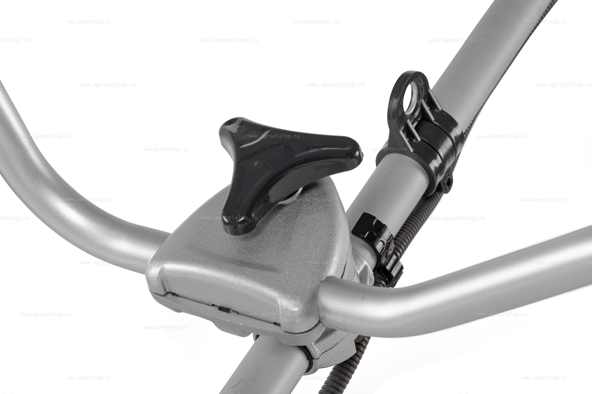 - Двуручная рукоятка при косьбе больших площадей позволяет выполнить спокойные, равномерные движения и делает управление устройством легким и эргономичным. Барашковым винтом можно быстро и без инструмента отрегулировать положение рукоятки для более комфортной работы.