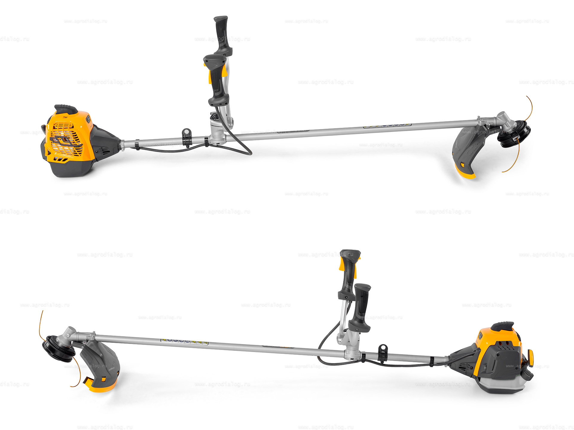 - Двуручная рукоятка при косьбе больших площадей позволяет выполнить спокойные, равномерные движения и делает управление устройством легким и эргономичным. Барашковым винтом можно быстро и без инструмента отрегулировать положение рукоятки для более комфортной работы.