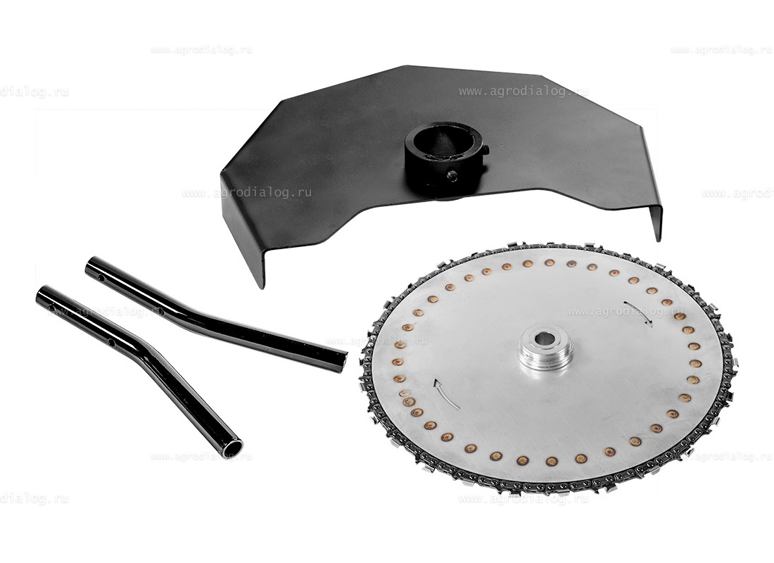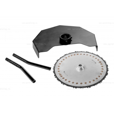 Диск с пильной цепью для сучковатых кустарников, тонких стволов деревьев диаметром около 8 см. Диаметр диска: 30 см. Вес: 4 кг. Данный товар приобретается только в комплекте с колесным триммером.