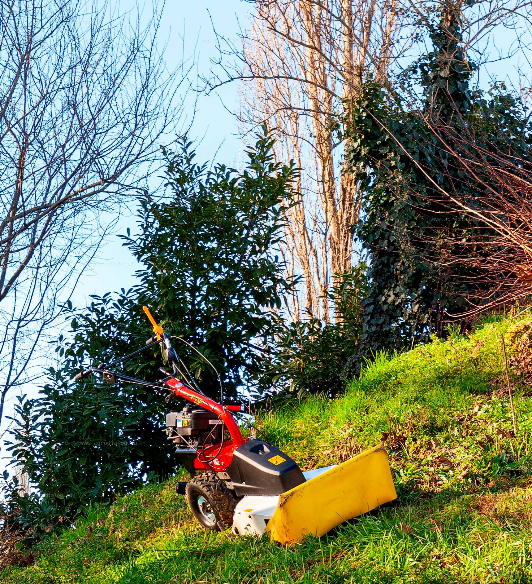 - Косилка имеет специальную конструкцию рамы, с низким центром тяжести, для лучшей устойчивости при кошении на склонах с уклоном до 20 градусов.