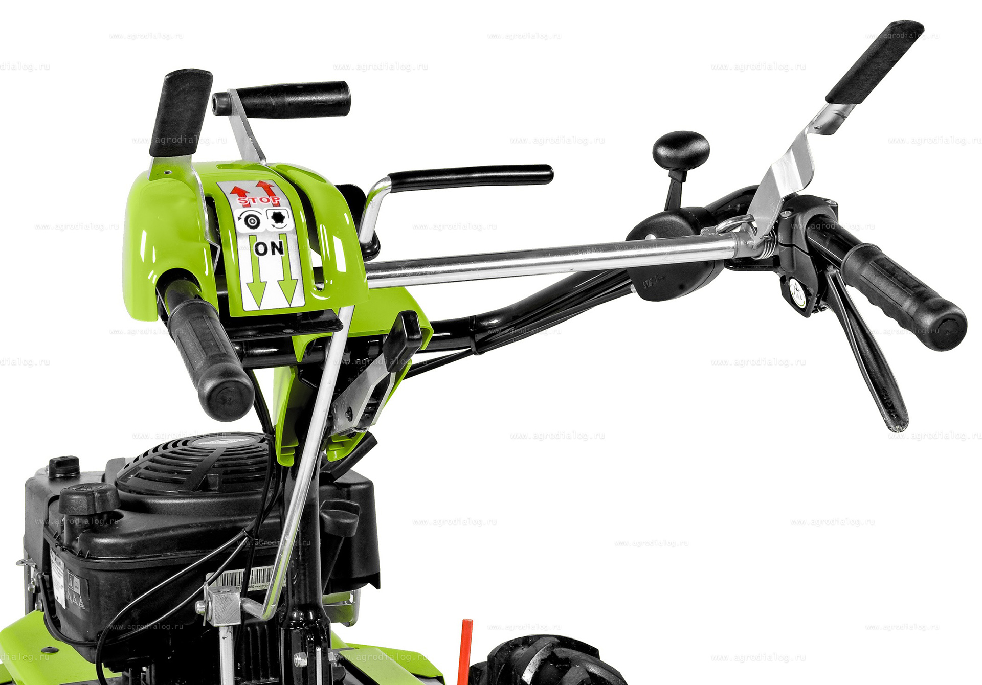 - Операторская рукоятка регулируется во всех направлениях: по высоте в соответствии с ростом оператора и по горизонтали для того, чтобы упростить стрижку в труднодоступных зонах, например, под низкими ветвями деревьев или вблизи препятствий.