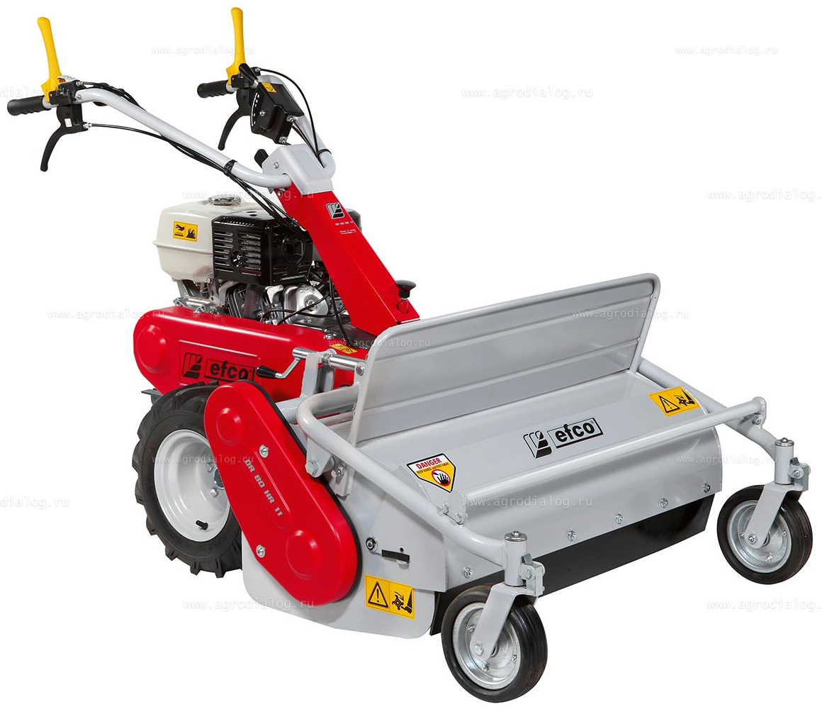 - Косилка-измельчитель Efco DR 80 HR 11 оснащена 4 колесами, из которых передние являются свободно вращающимися для обеспечения уменьшенного радиуса поворота и максимальной маневренности.