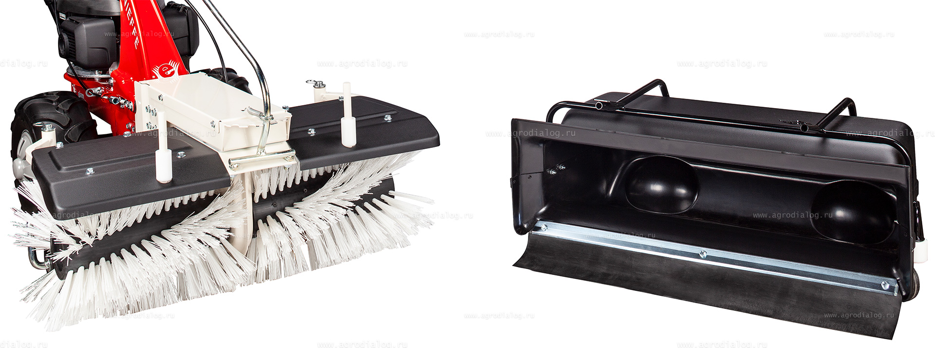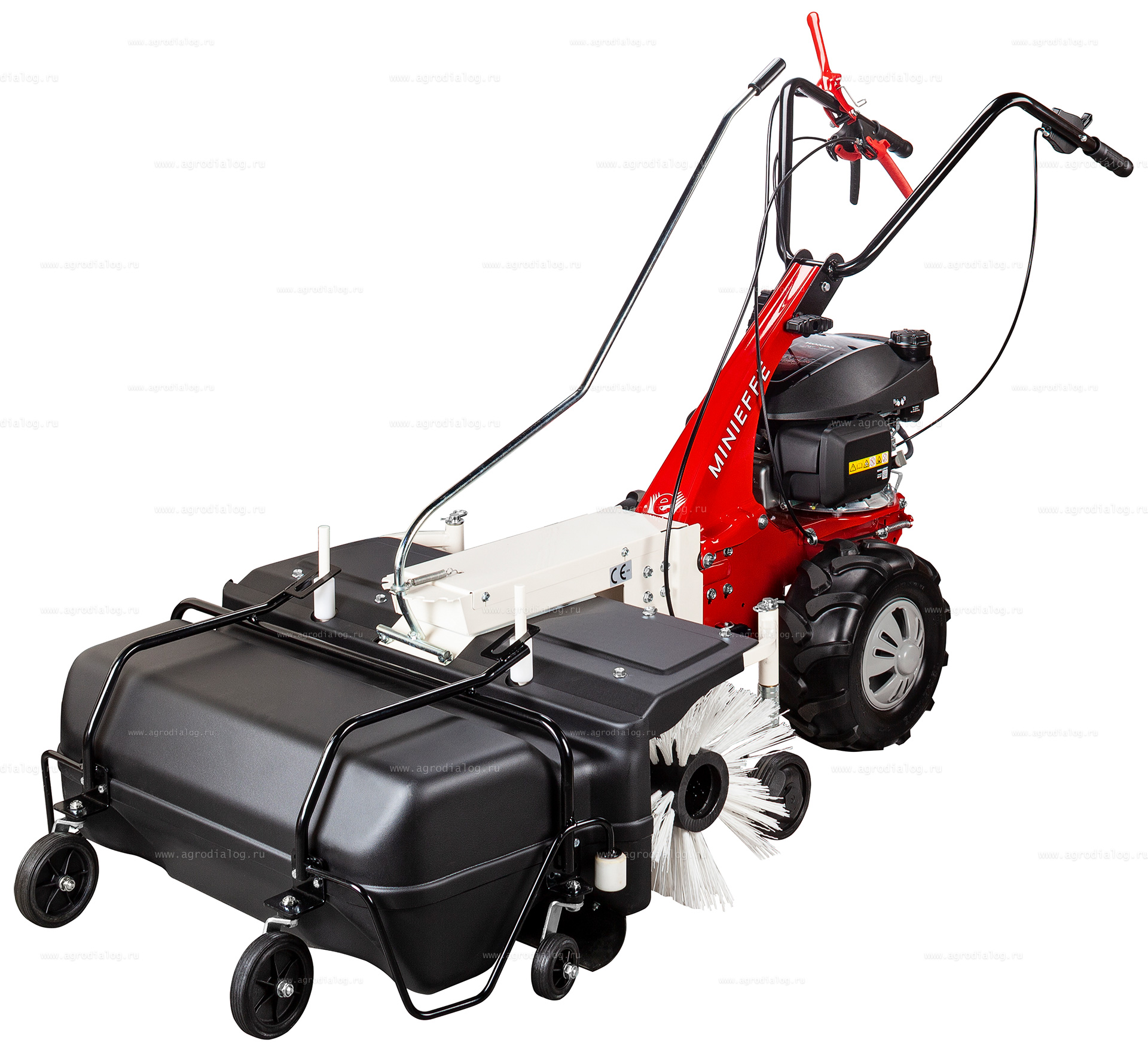 Коммунальная щетка с бункером 907410000 для Eurosystems MINIEFFE. Щетка регулируется под пятью разными углами. Ширина щетки 88 см. Диаметр щетки 30 см. ABS коллектор 85x40x29 см. с опорными колесами.