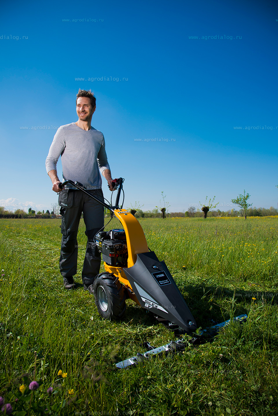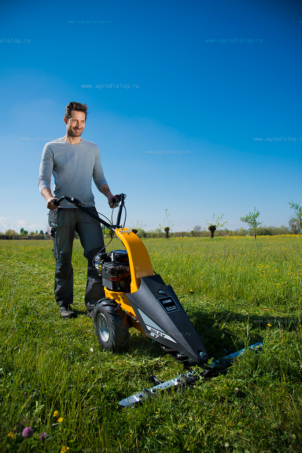 Сенокосилка отличается прочной массивной конструкцией, маневренностью и устойчивостью, что обеспечивает максимальный комфорт во время кошения.