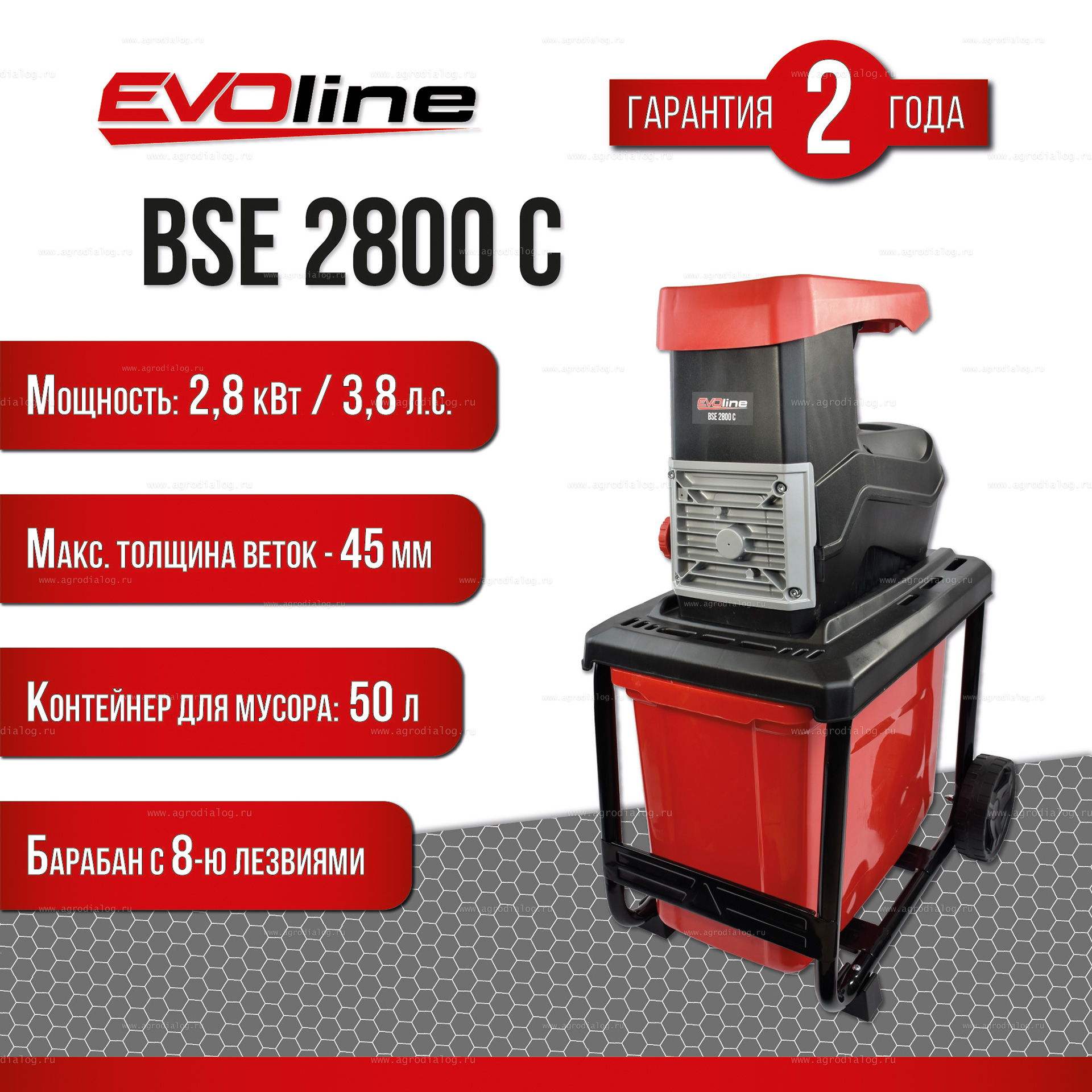 - Электрический садовый измельчитель EVOline BSE 2800 C имеет высокий коэффициент измельчения 10:1.