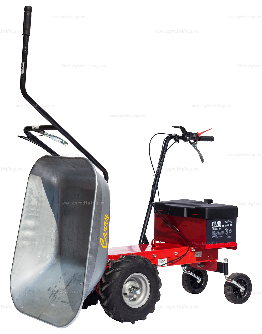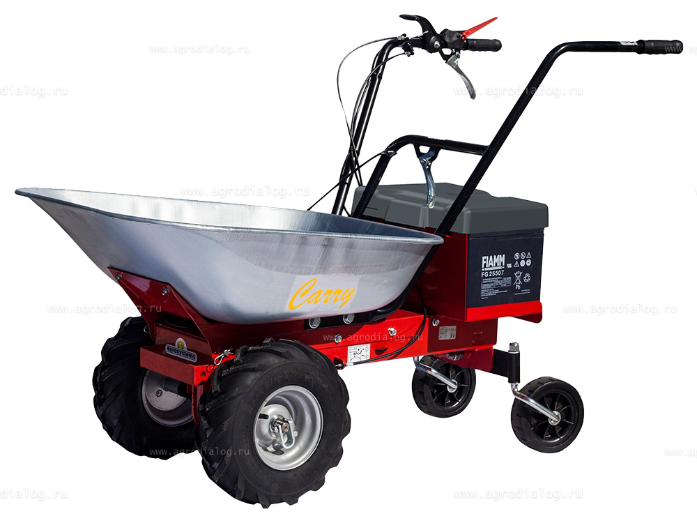 Самоходная тележка Eurosystems Carry Batteries powered для домашнего использования. Компактная и легко управляемая - большая помощь в садах и лесистой местности для перевозки не только садового мусора, удобрений или урожая, но и более тяжелых материалов, таких как дрова, гравий, песок. Угол опрокидывания корыта 60°. Опрокидывание выполняется вручную с помощью специального рычага. Две аккумуляторные свинцово - кислотные батареи 12V55Ah являются источником энергии для питания самоходной тележки. Время автономной работы на ровной поверхности - 2,5 ч. Широкие обрезиненные колеса позволяют самоходной тележке Carry Batteries powered легко передвигаться даже по неровным участкам. Задние колеса на поворотных осях для легкого маневрирования. Разблокировка дифференциала для поворота с помощью фиксаторов на передних колесах. Малый радиус разворота для лучшей маневренности в ограниченном пространстве. Грузоподъемность - 100 кг. / 75 кг. при работе на 35% склонах. Объём корыта - 85 литров.