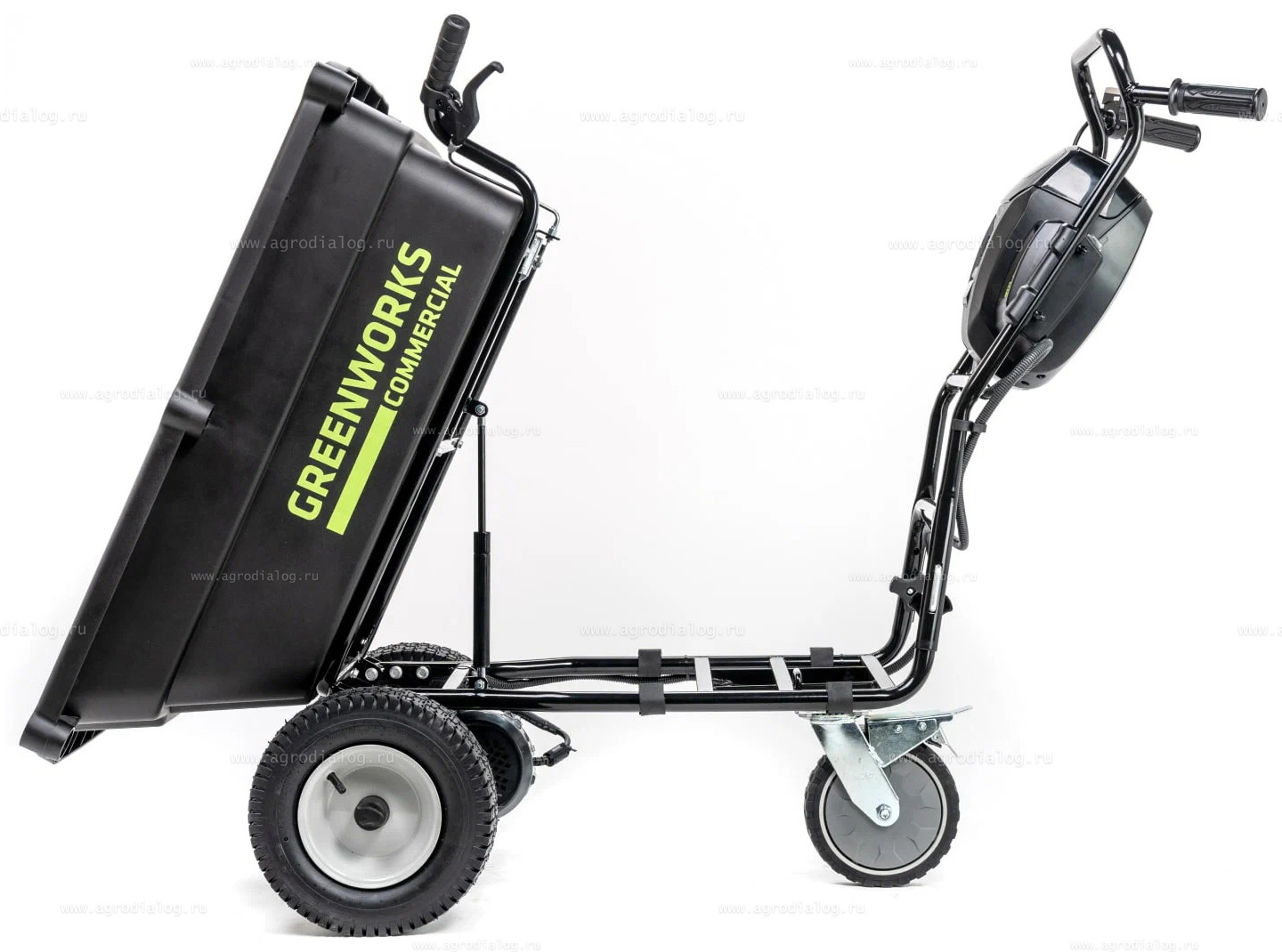 Для удобной выгрузки материала аккумуляторная самоходная тележка Greenworks 82GCK5 имеет подъемный механизм с газовым упором. Опрокидывание выполняется вручную с помощью рычага.