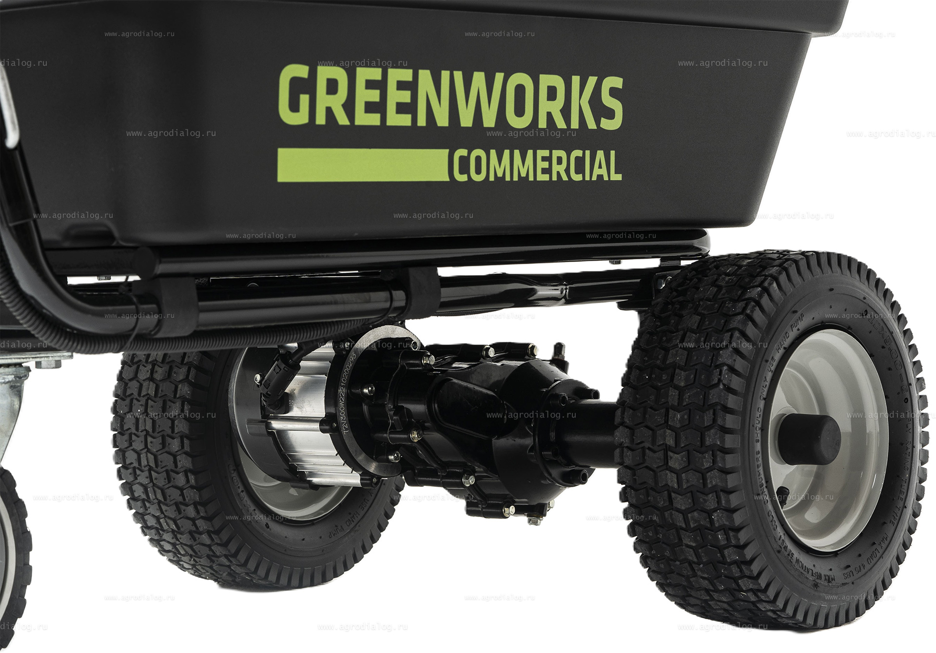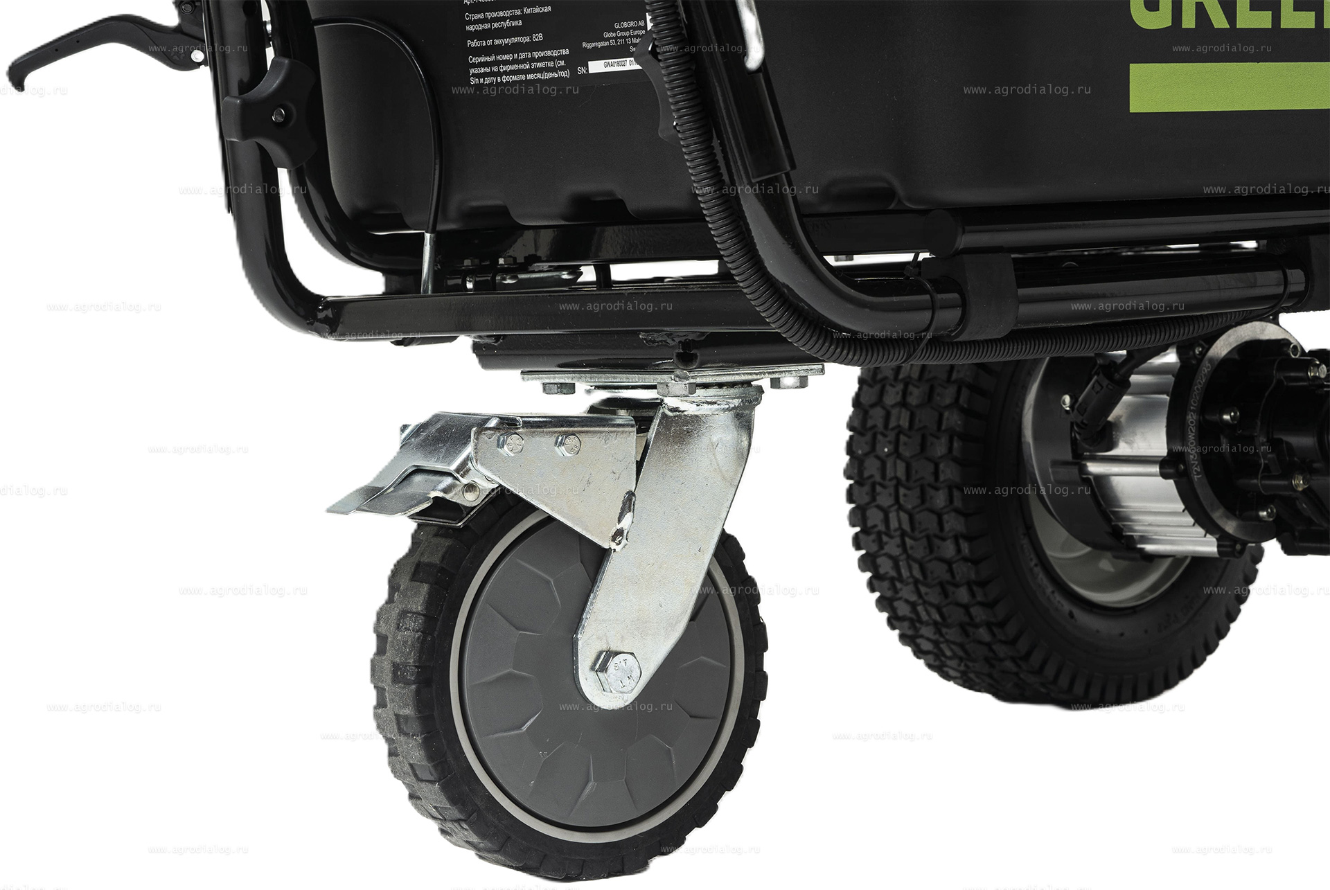 Для легкого передвижения на участках со сложным рельефом аккумуляторная самоходная тележка Greenworks 82GCK5 снабжена широкими обрезиненными колесами со специальным протектором. Заднее колесо на поворотной оси существенно облегчает маневрирование.
