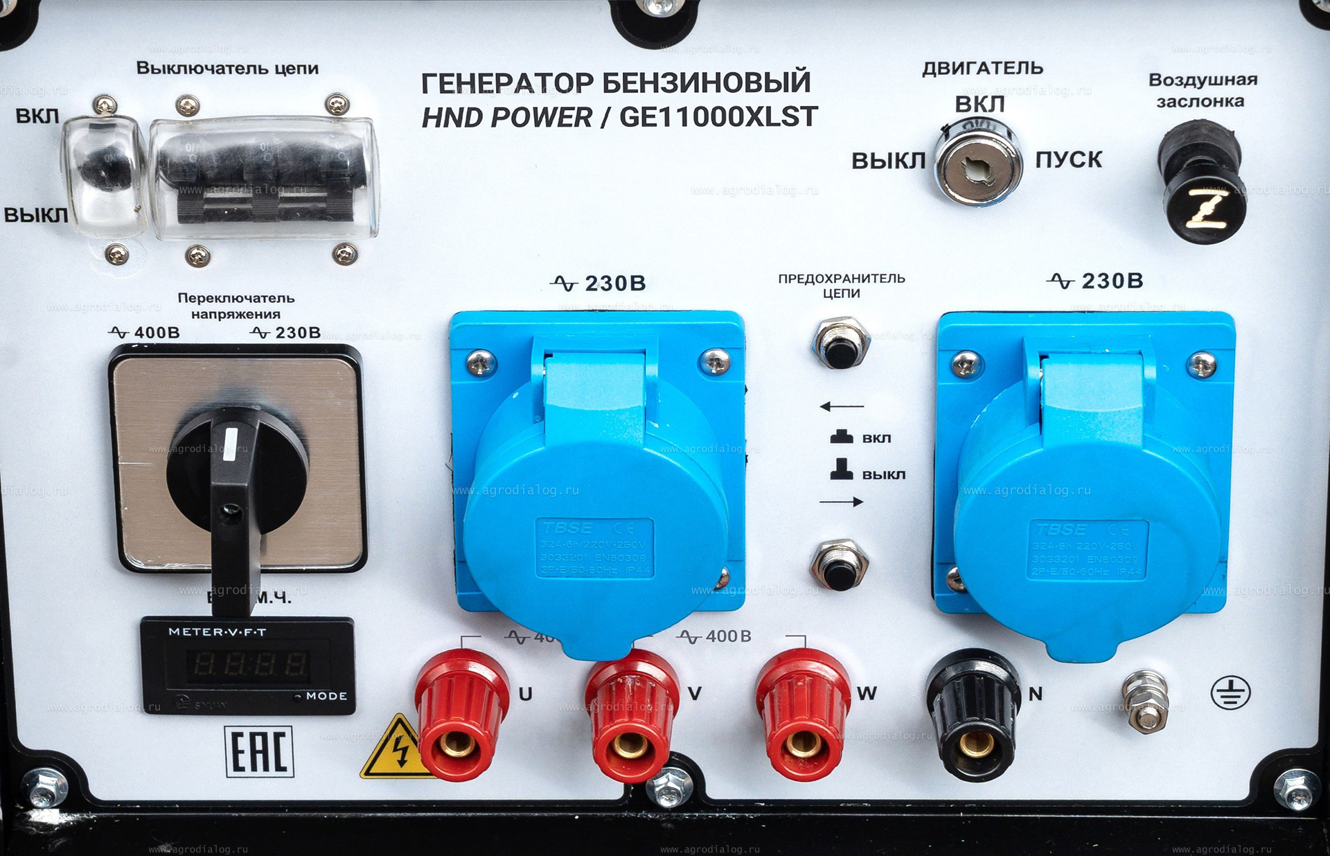 - Переключатель напряжения даёт возможность использовать по очереди 1 фазную или 3-х фазную цепь переменного тока. В режиме трёхфазной цепи можно подключить потребители к напряжению 400В (комбинация клемм U-V-W) и к напряжению 230В, задействовав нейтральную клемму N (комбинация U-N, V-N, W-N).