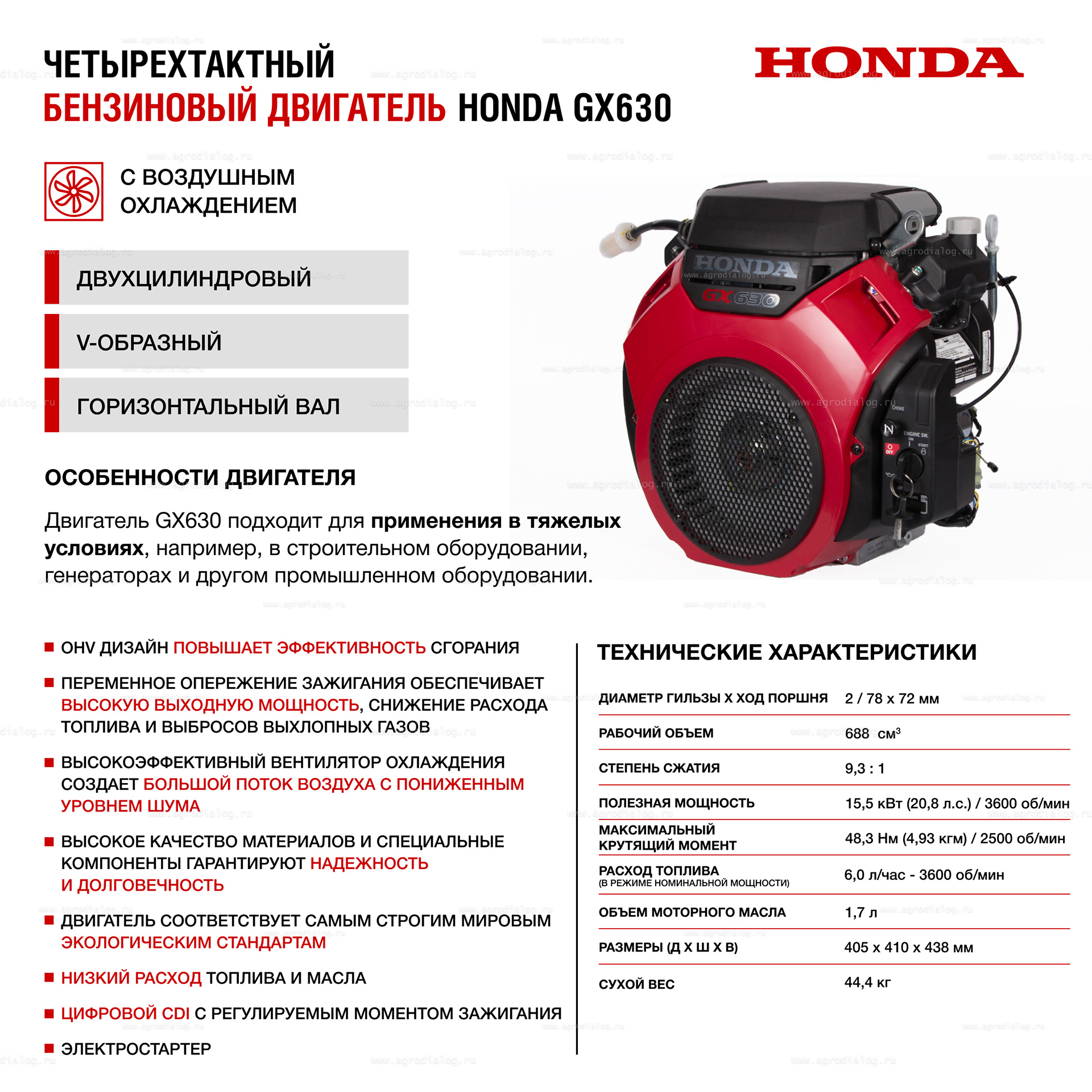 - Четырёхтактный двухцилиндровый двигатель Honda GX630 отличается высокими эксплуатационными характеристиками, надежностью и собран из высококачественных компонентов.