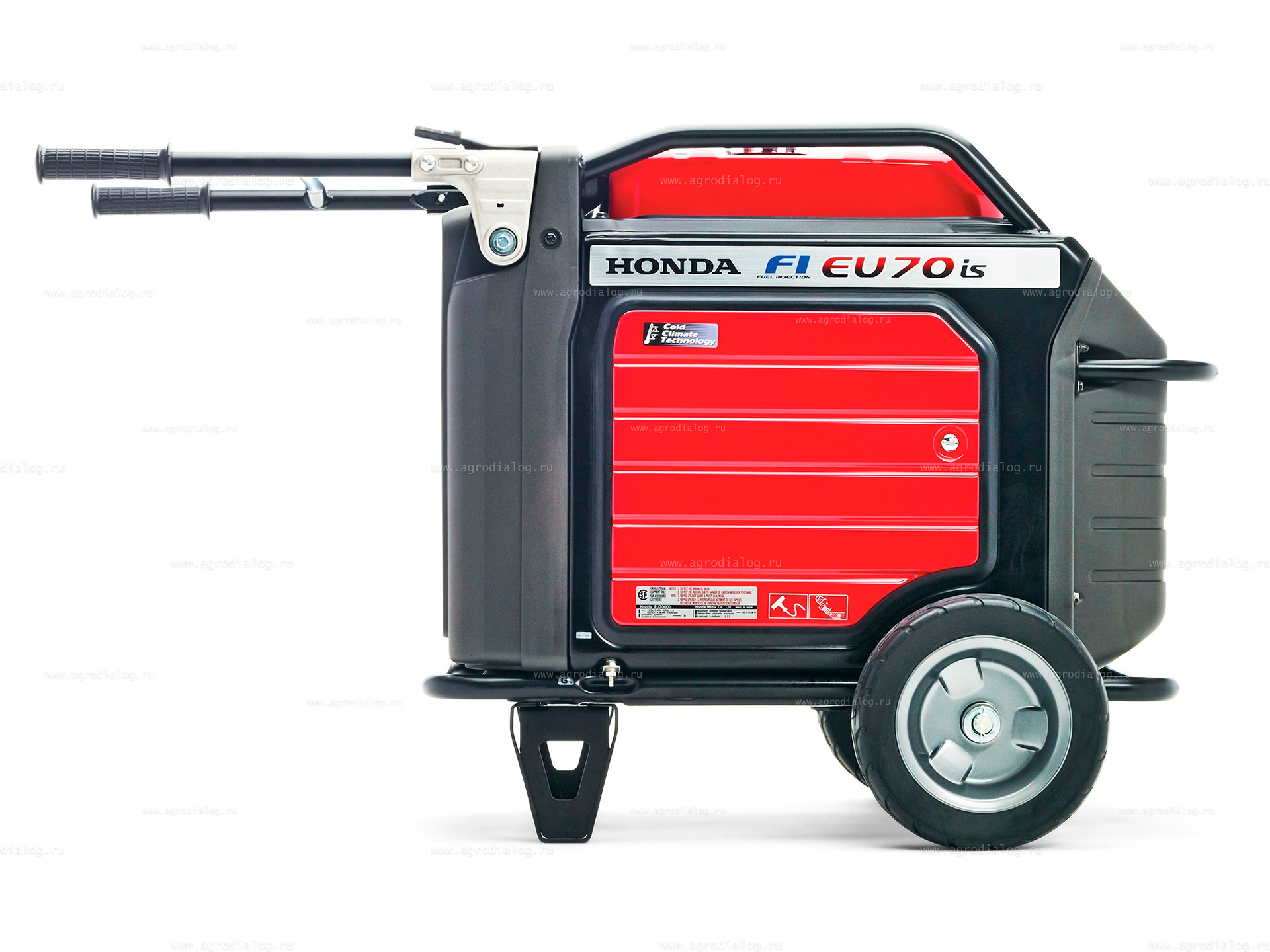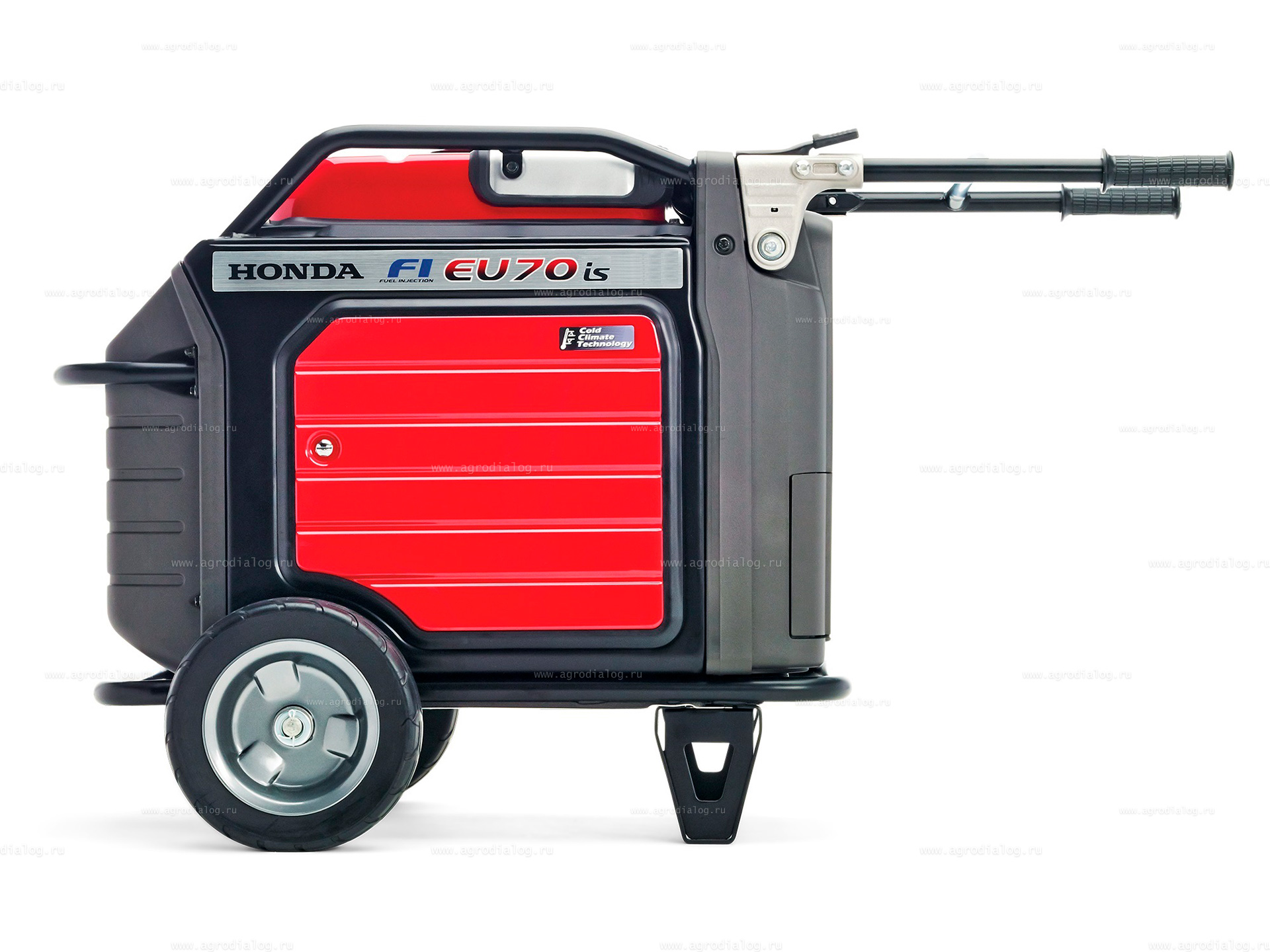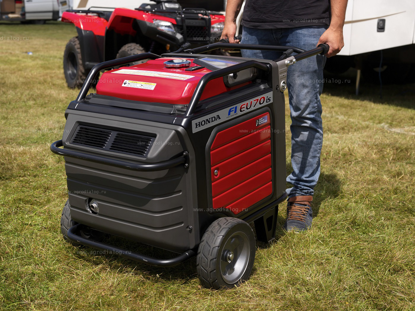 - Большие колеса и складные ручки позволяют перевозить бензиновый генератор Honda EU70is между рабочими зонами.