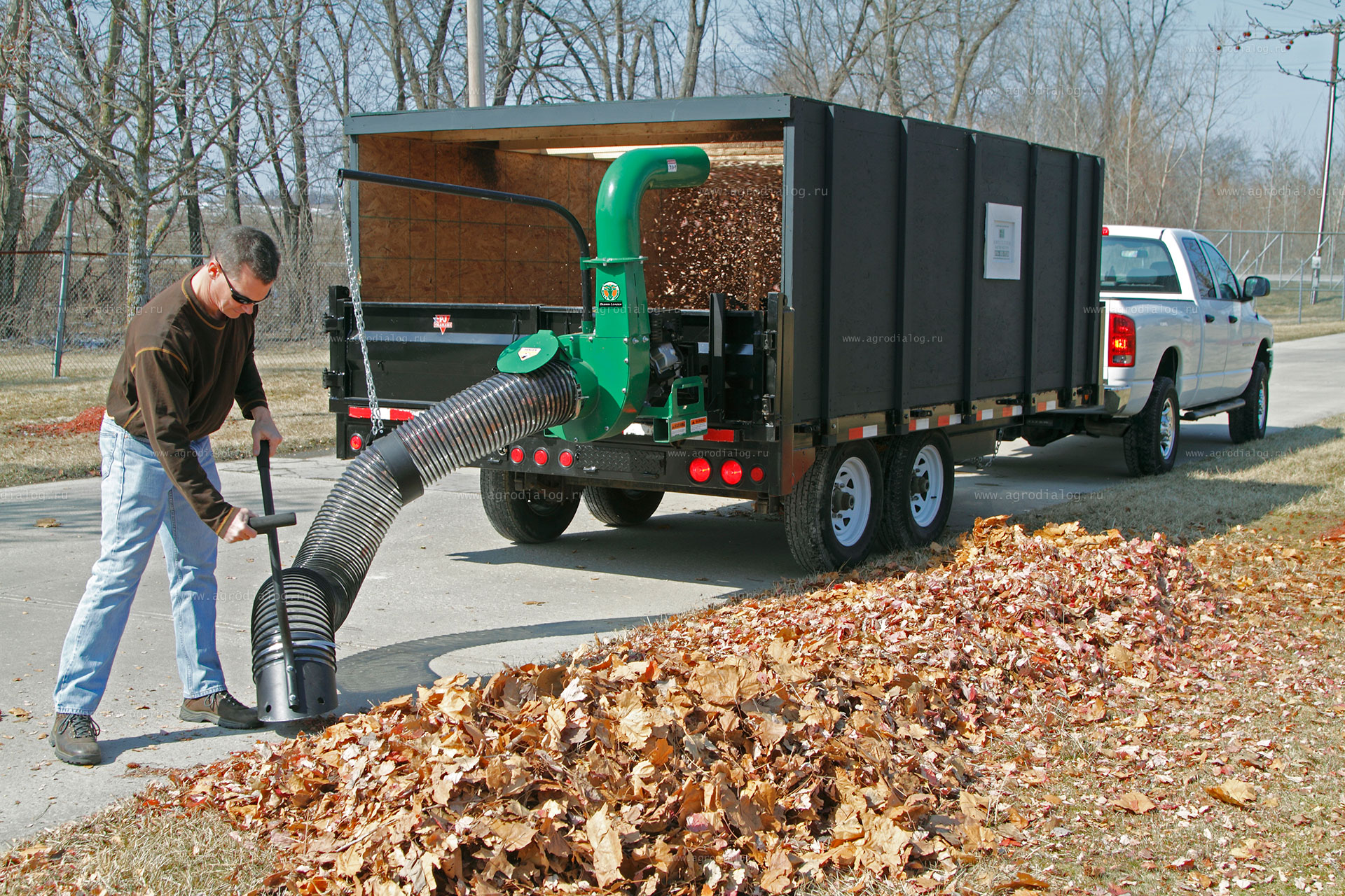 Принцип работы пылесоса довольно простой, с помощью гофрированного всасывающего шланга мусор попадает на измельчающие ножи, которые его разбивают, а затем на крыльчатку, которая отбрасывает его через разгрузочный шланг в приемный бункер – накопитель. Его можно устанавливать на любые коммерческие транспортные средства с открытым кузовом или садовый трактор с прицепом.