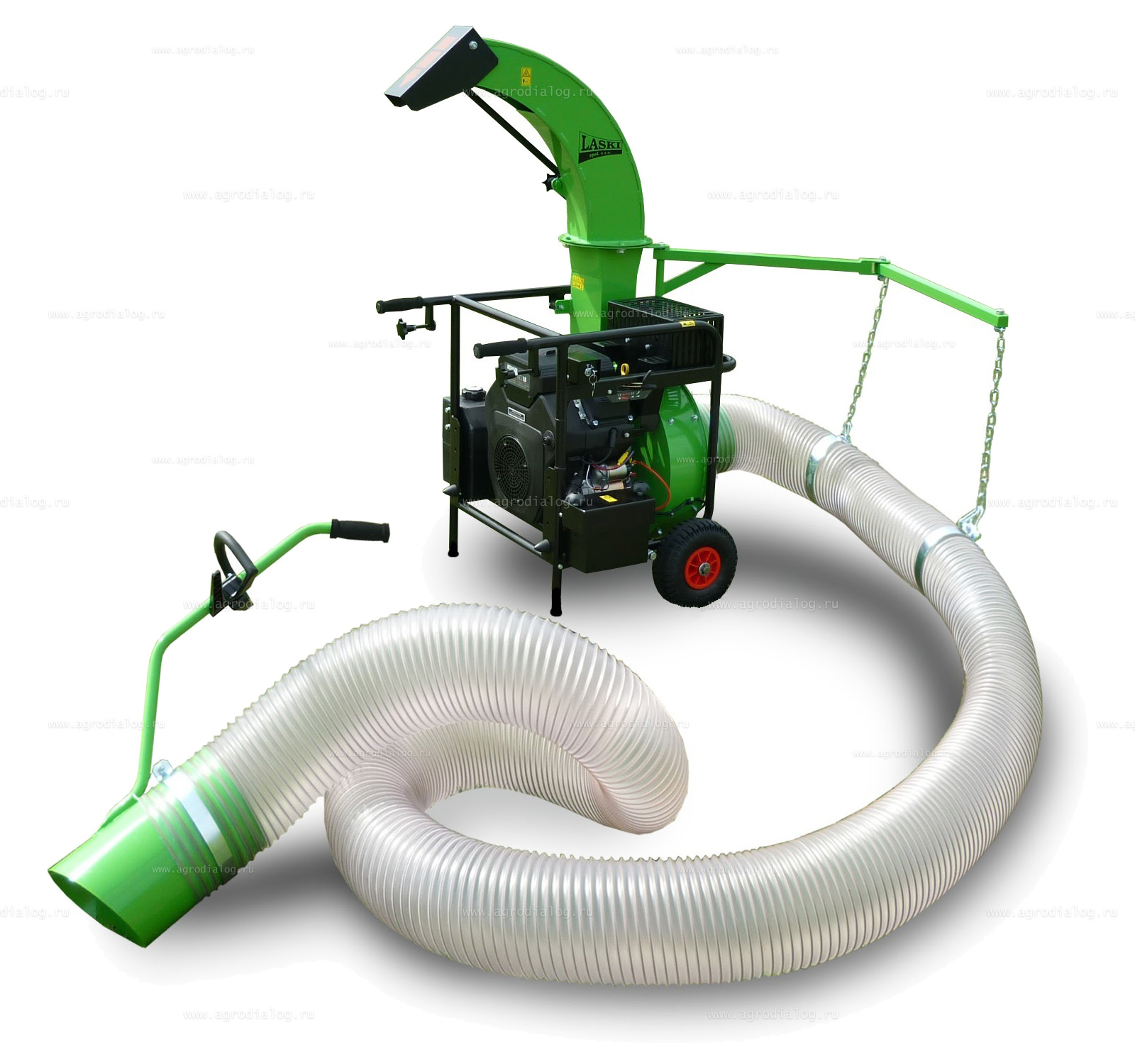 Принцип работы пылесоса довольно простой, с помощью гофрированного всасывающего шланга мусор попадает на измельчающие ножи, которые его разбивают, а затем на крыльчатку, которая отбрасывает его через разгрузочный шланг в приемный бункер – накопитель. Его можно устанавливать на любые коммерческие транспортные средства с открытым кузовом или садовый трактор с прицепом.
