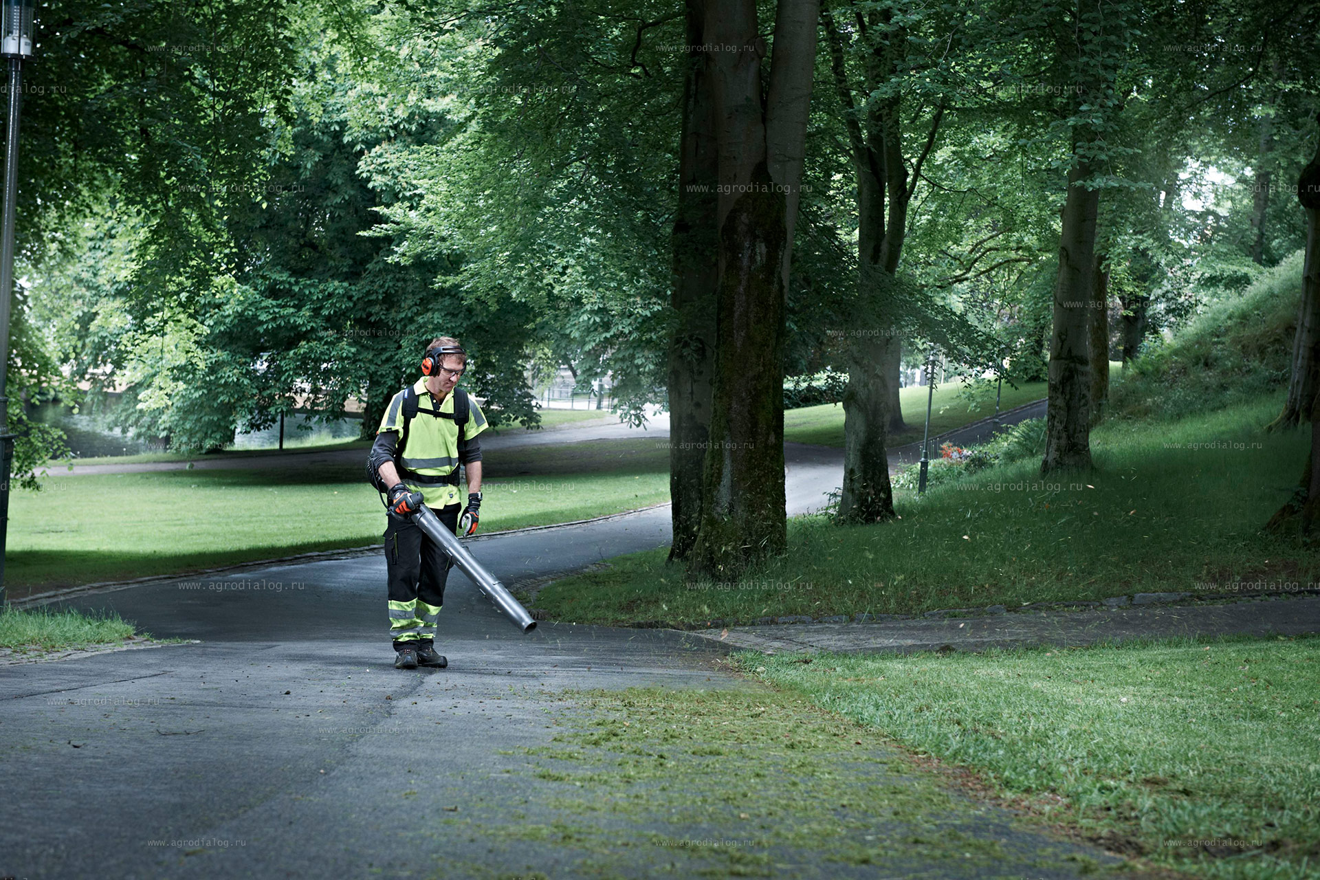 Садовая воздуходувка ранцевая Husqvarna 580 BTs используется в основном для производительной очистки больших площадей от опавшей листвы, скошенной травы или бумажного мусора.