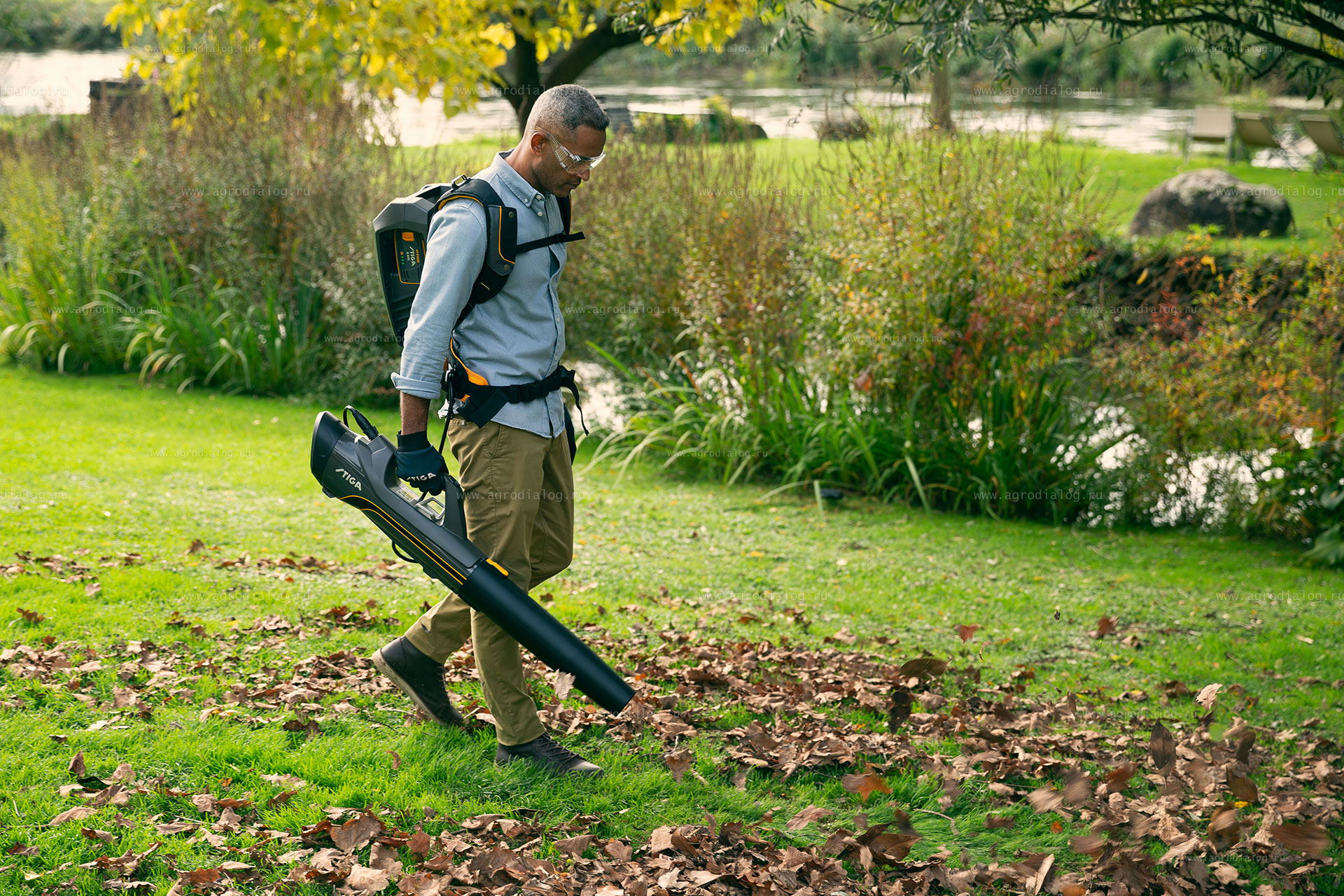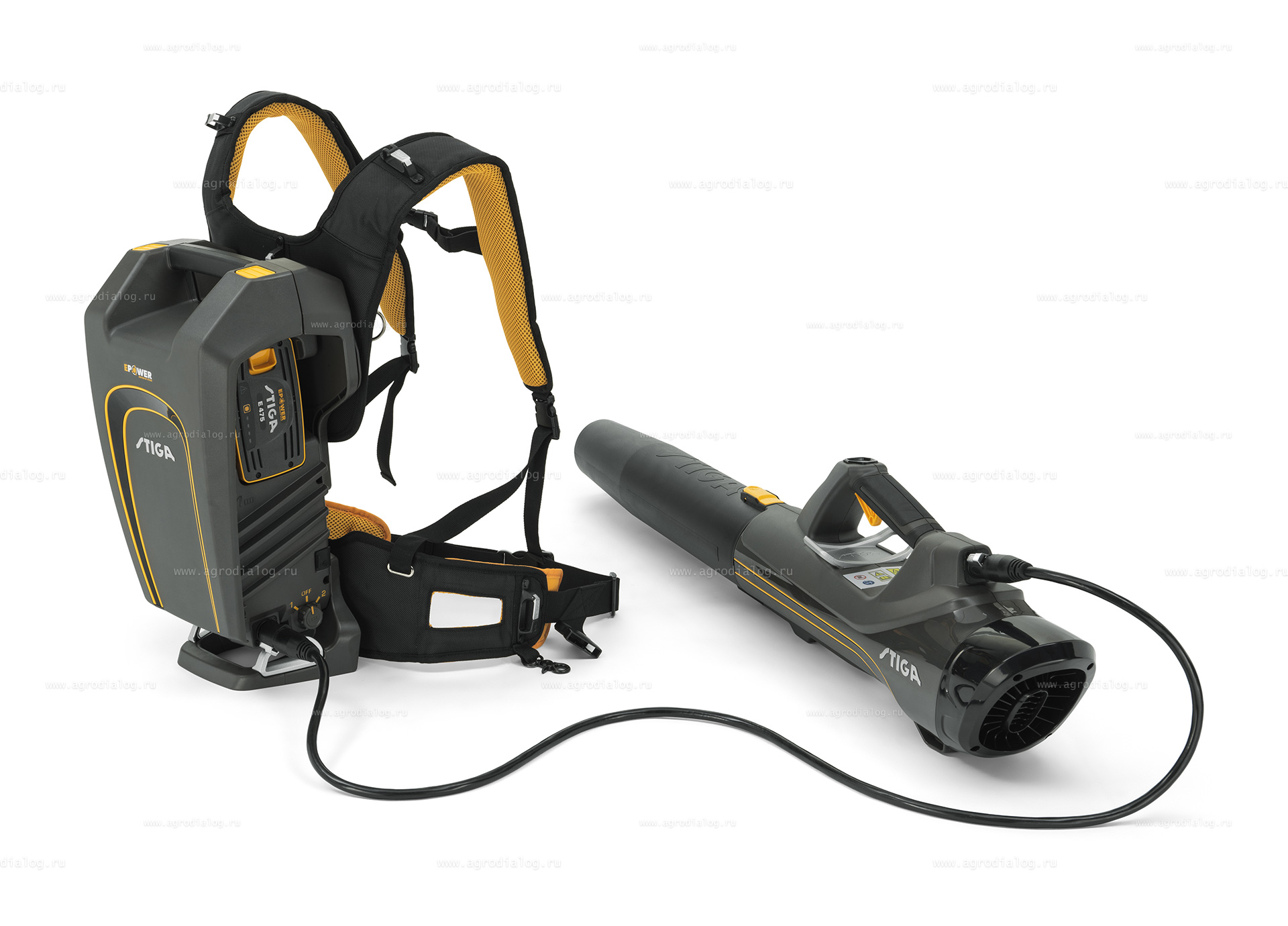 - Особенностью этого устройства является отсутствие гнезда для стандартного аккумулятора. Аккумулятор устанавливается в ранцевую систему Stiga SBH 900 AE и подключается к воздуходувке с помощью коннектора. Таким образом в руках вы держите только сам воздуходув и не нагружаете руку дополнительным весом от аккумулятора.
