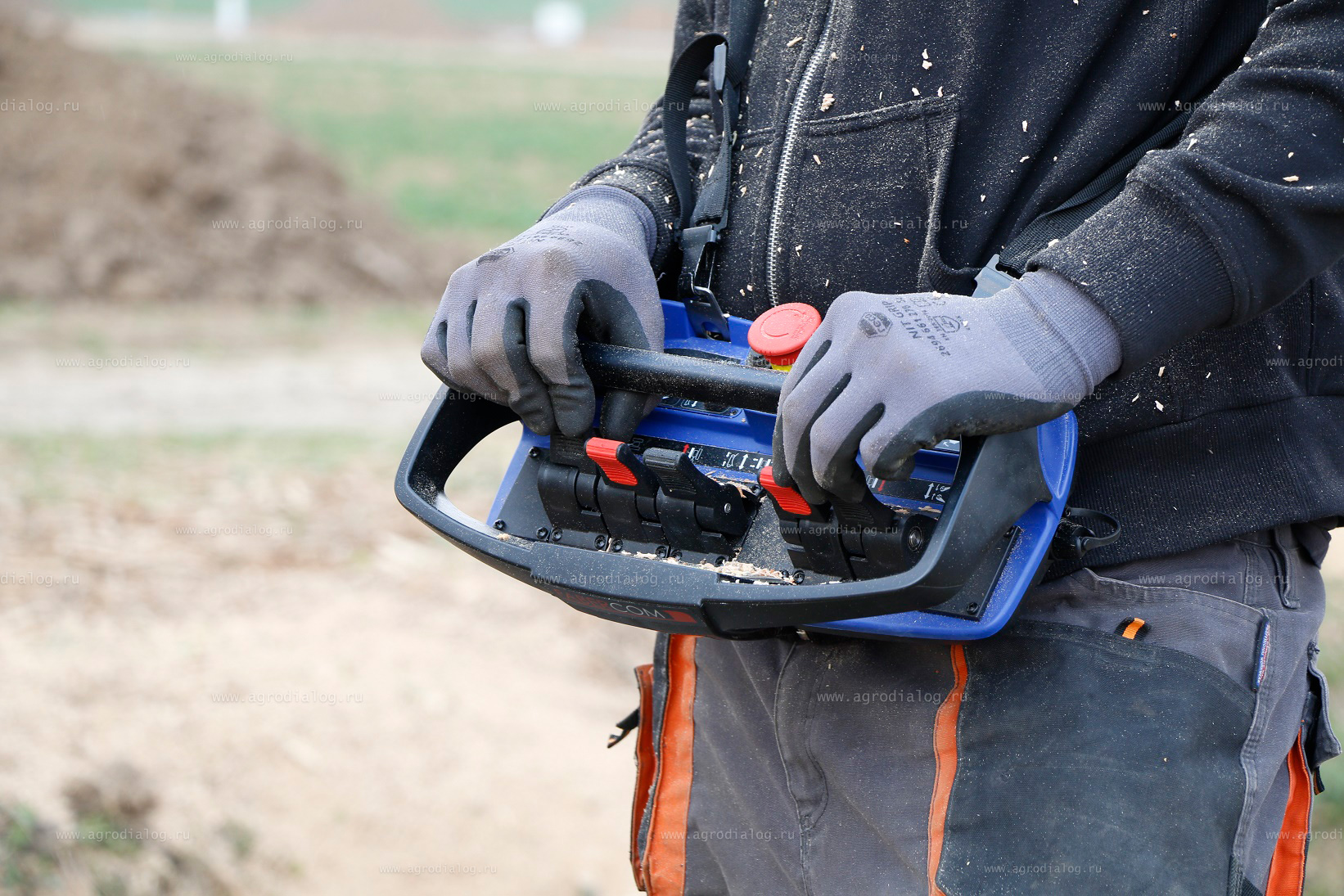 - Пульт дистанционного управления позволяет перемещать технику и осуществлять управление измельчающим диском.