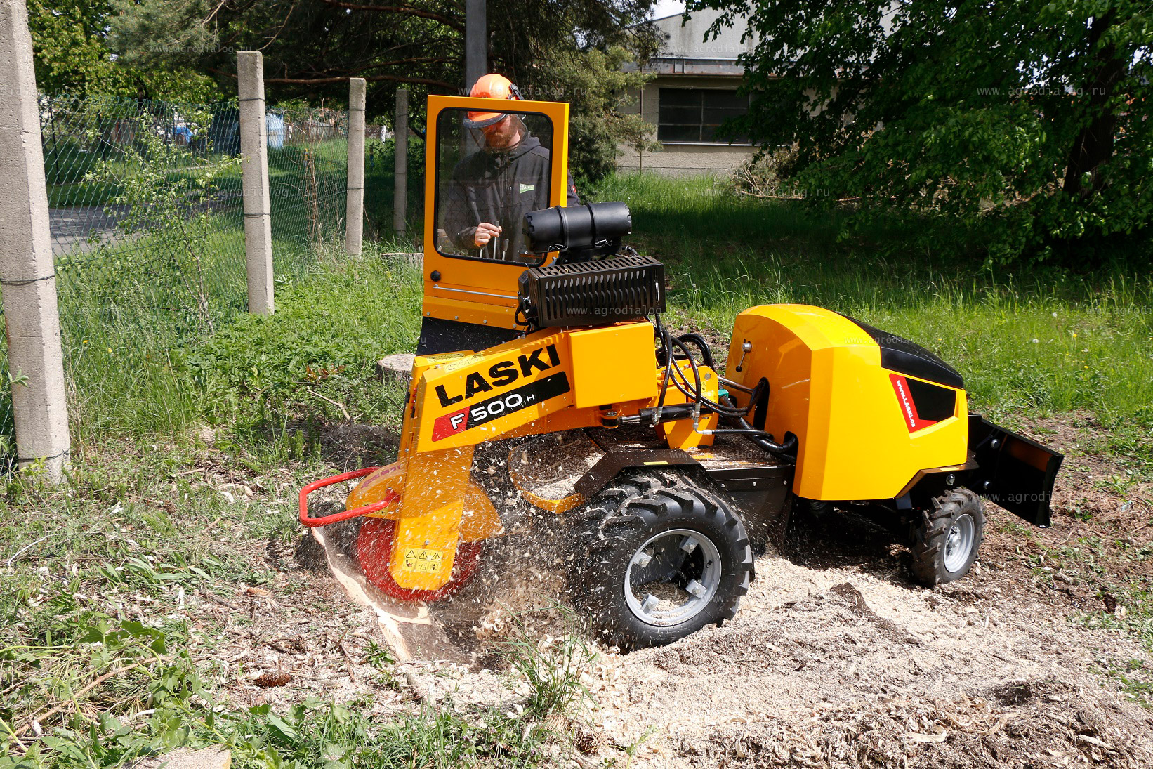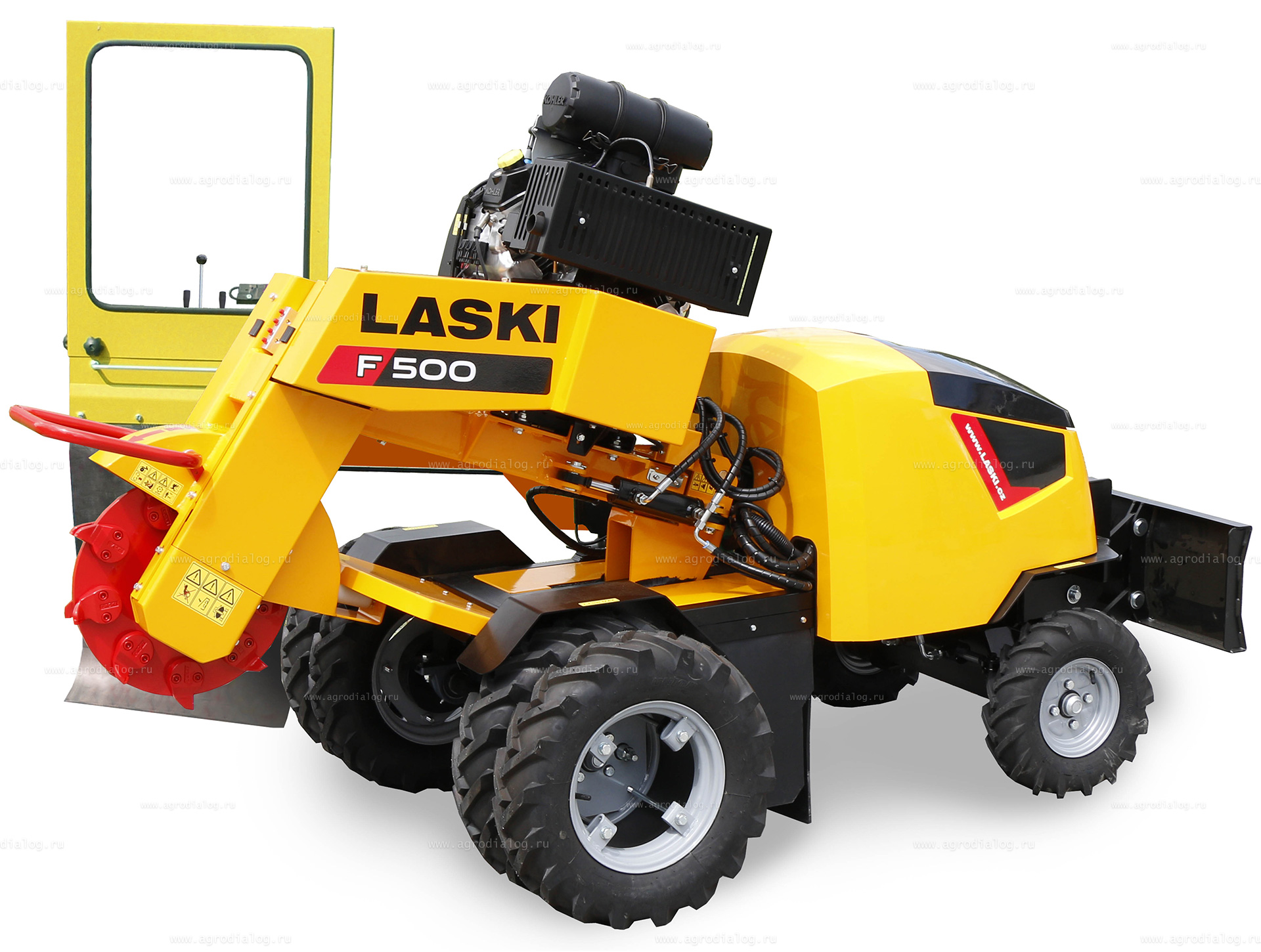 - Фрезерный самоходный измельчитель Laski F500H/27 оснащен стальным отвалом, при помощи которого можно убрать сыпучие и рыхлые скопления такие как, грунт, песок, щебень, щепа, а также выровнять площадку после выполнения работ по удалению пней.
