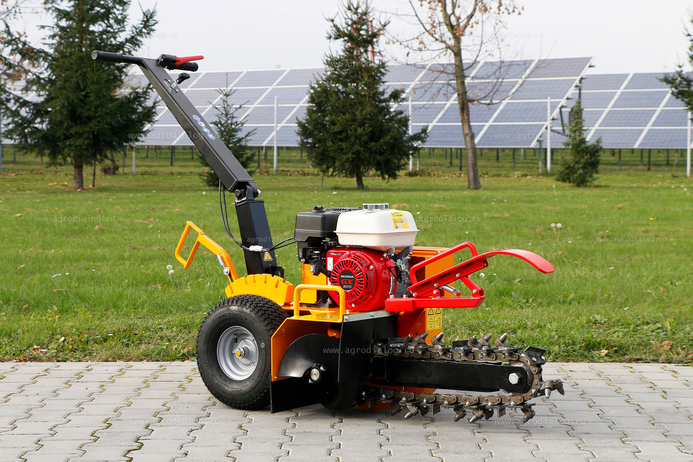 - Широкие пневматические колеса со специальным протектором позволяют легко передвигать траншеекопатель по участкам со сложным рельефом.