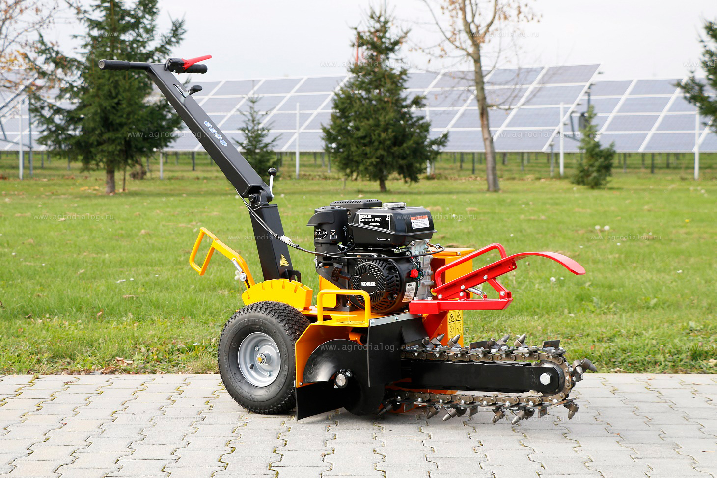 - Широкие пневматические колеса со специальным протектором позволяют легко передвигать траншеекопатель по участкам со сложным рельефом.