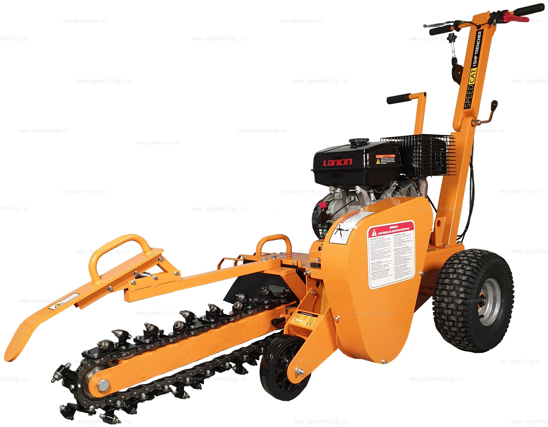 - Широкие пневматические колеса со специальным протектором позволяют легко передвигать траншеекопатель по участкам со сложным рельефом.