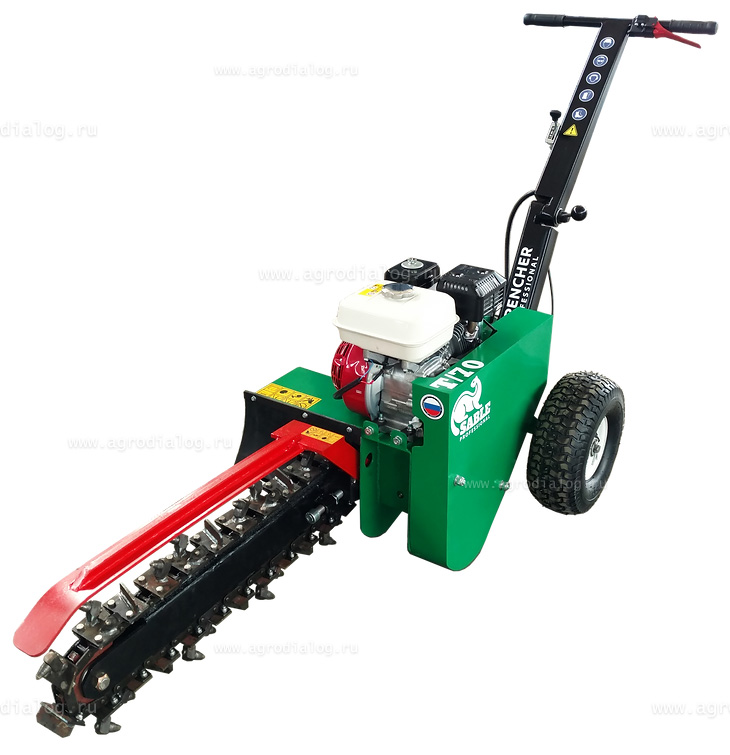 - Широкие пневматические колеса со специальным протектором позволяют легко передвигать траншеекопатель по участкам со сложным рельефом.