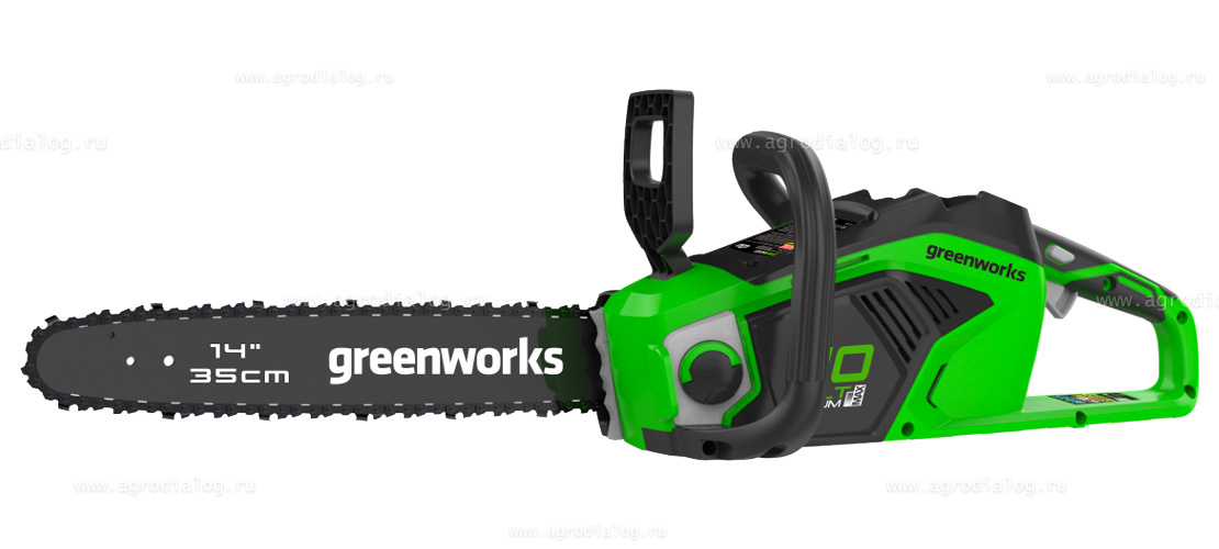 - Аккумуляторная пила Greenworks GD40CS15K4 имеет чрезвычайно простые органы управления. Это означает, что вы можете справиться с любой задачей комфортно и уверенно, и для этого вам потребуется всего одно нажатие кнопки.