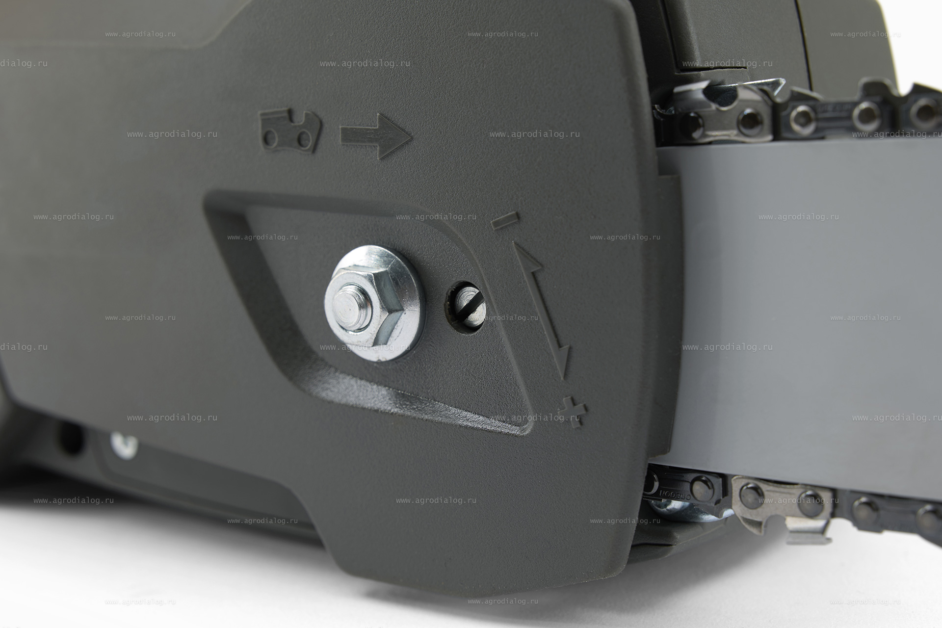 - Боковое натяжение цепи делает ее регулирование быстрым и легким. Доступ к натяжному винту обеспечивается сбоку через крышку цепной звёздочки. Это предотвращает контакт рук с острой цепью и кончиками зубчатого упора.