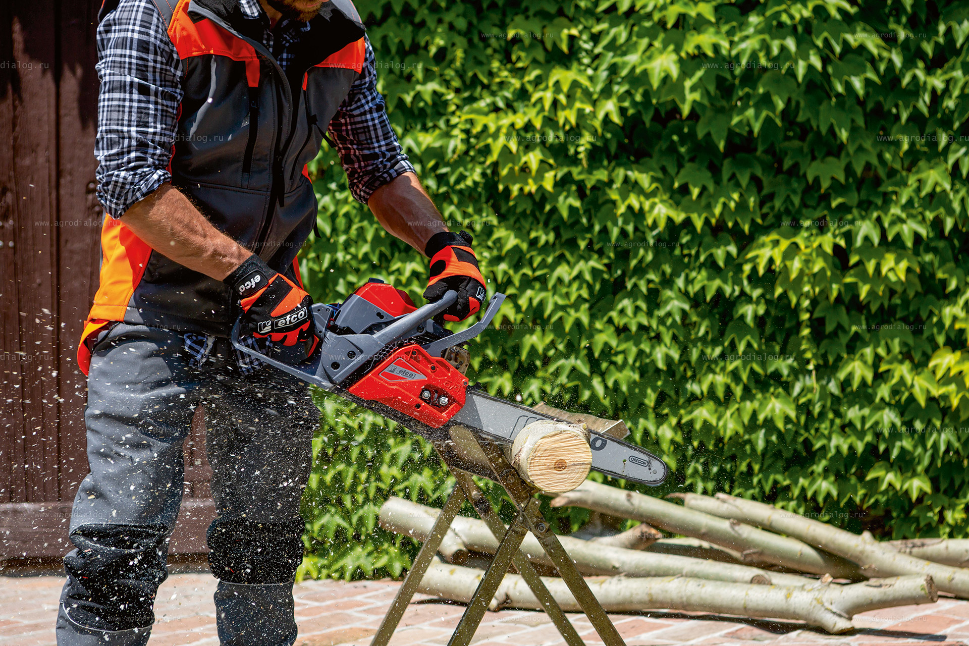 - Бензопила Efco MT 4510 (18") оборудована боковым натяжением цепи. Доступ к натяжному винту обеспечивается сбоку через крышку цепной звёздочки. Это предотвращает контакт рук с острой цепью и кончиками зубчатого упора.