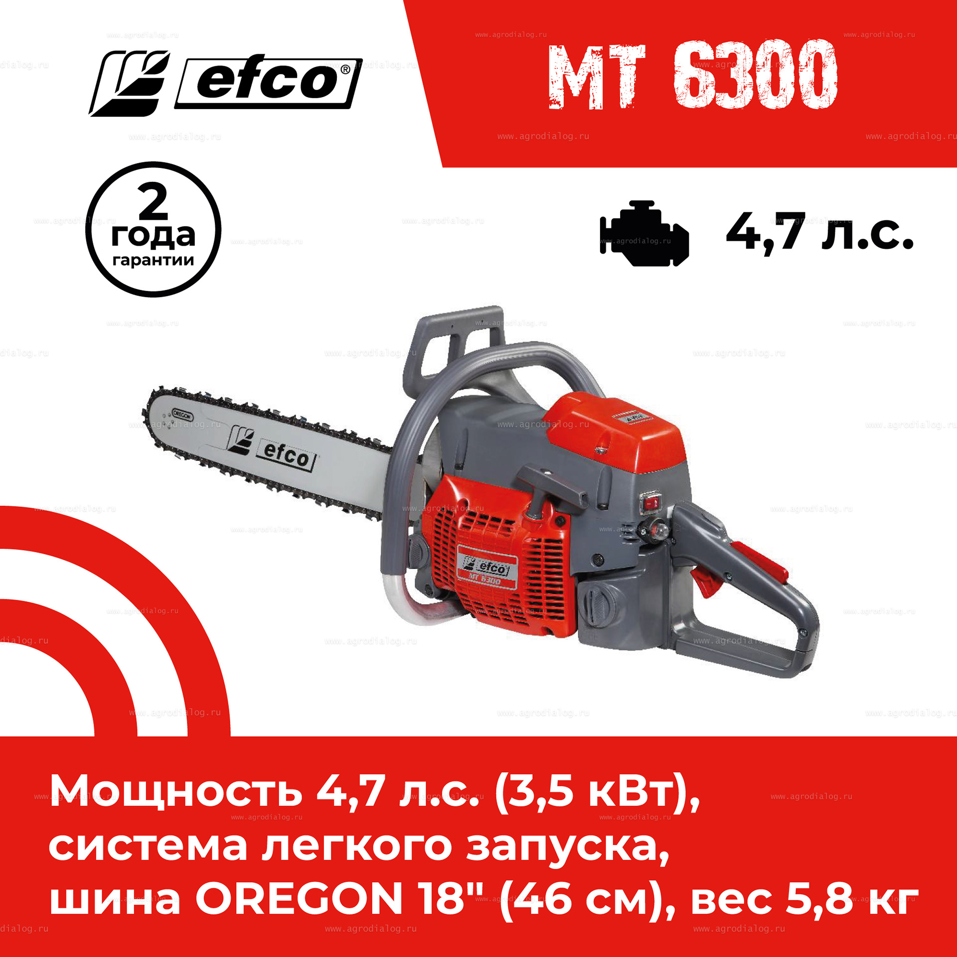 - Если для Вас важна высокая производительность и долгий срок эксплуатации, то профессиональная бензопила Efco MT 6300 – правильный выбор.