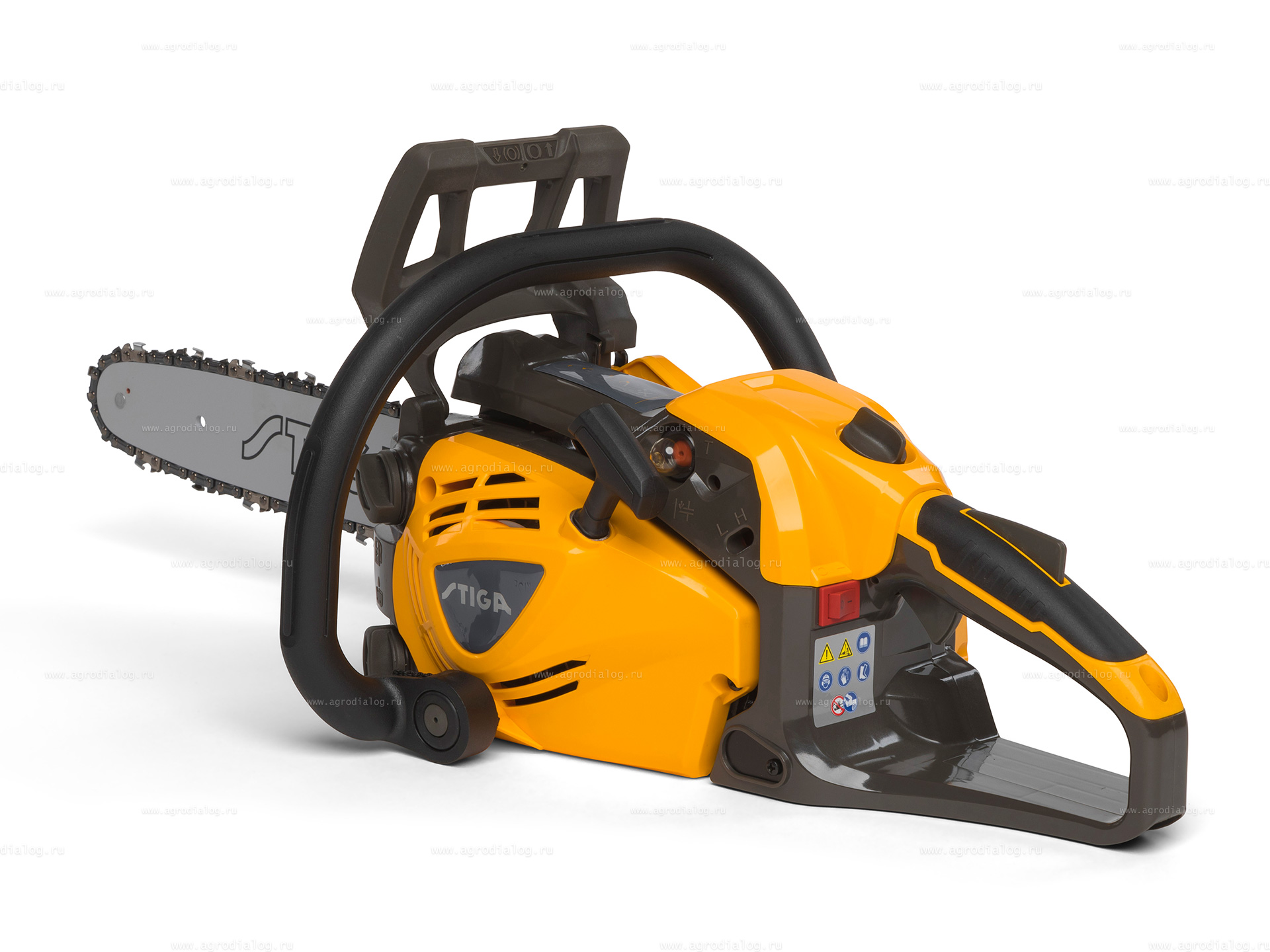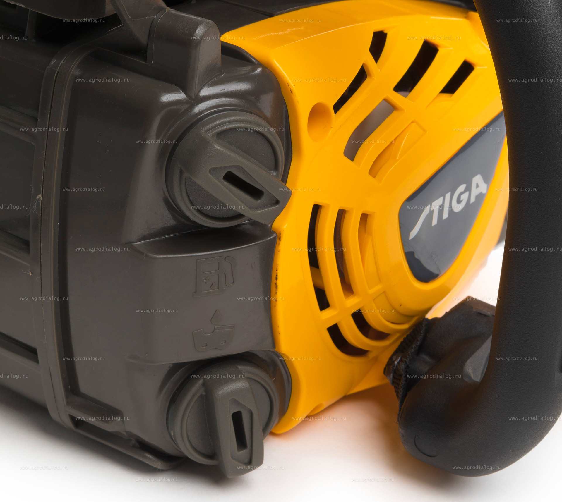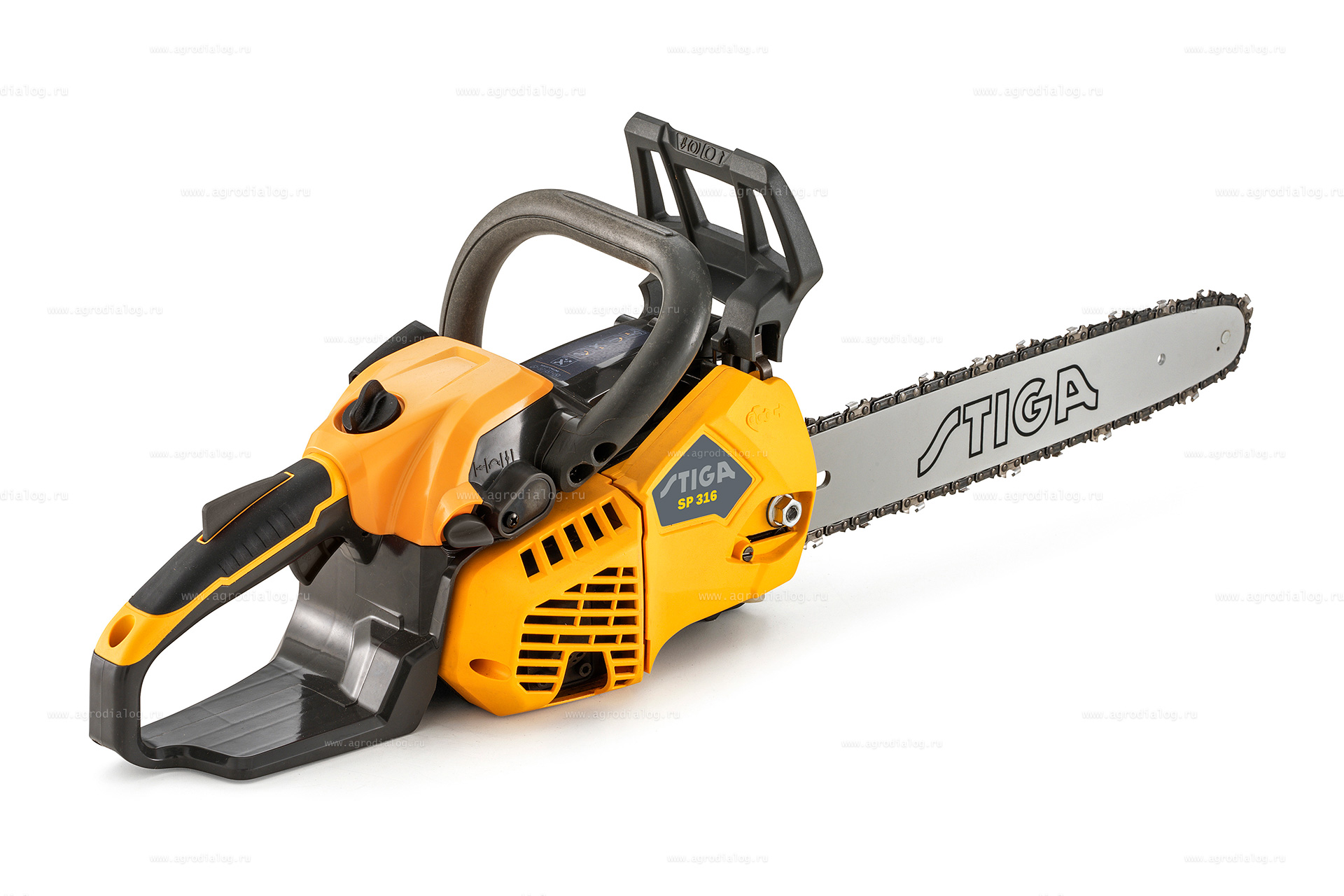 - Бензопила Stiga SP 316 оборудована боковым натяжением цепи. Доступ к натяжному винту обеспечивается сбоку через крышку цепной звёздочки. Это предотвращает контакт рук с острой цепью и кончиками зубчатого упора.