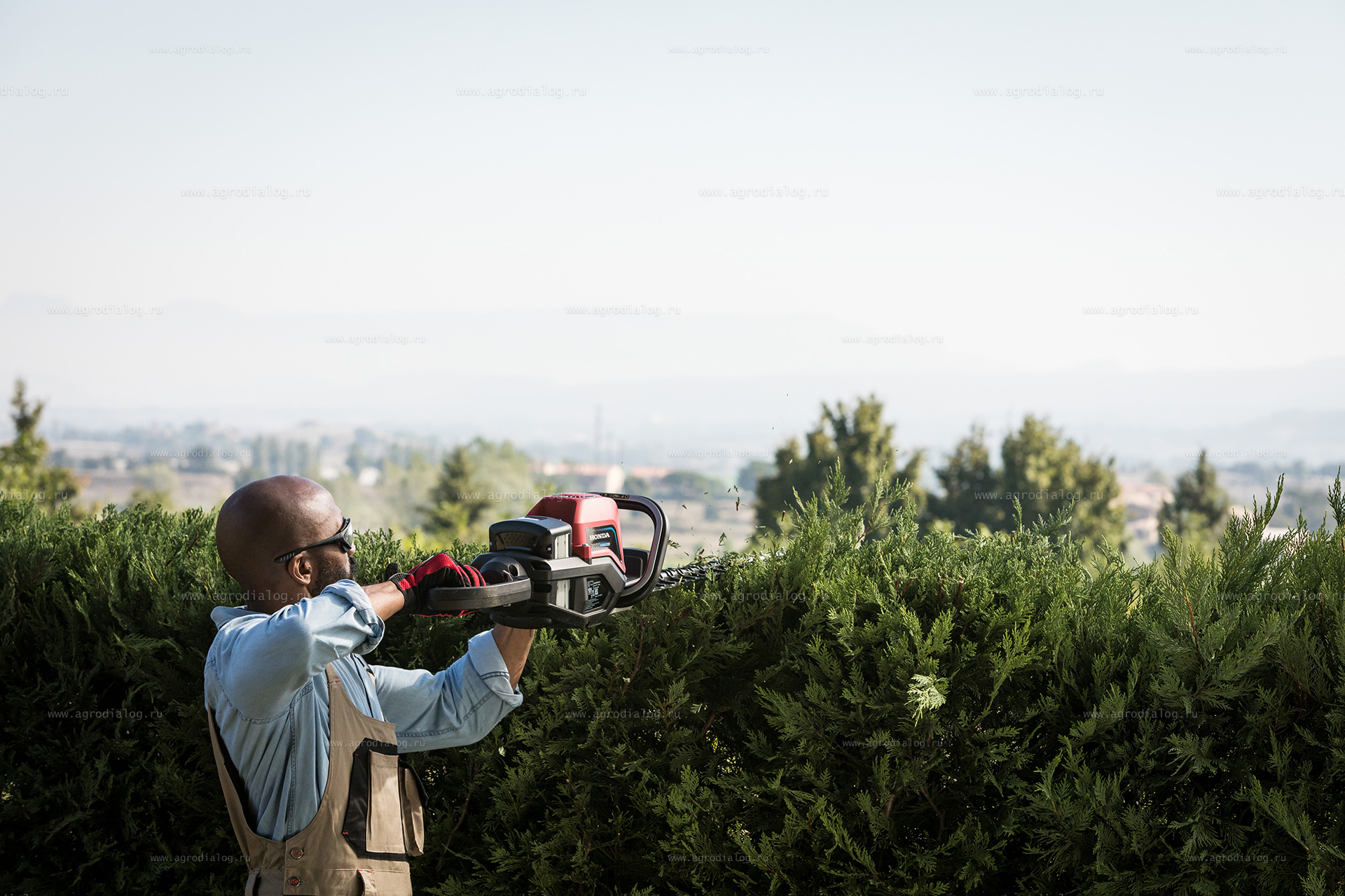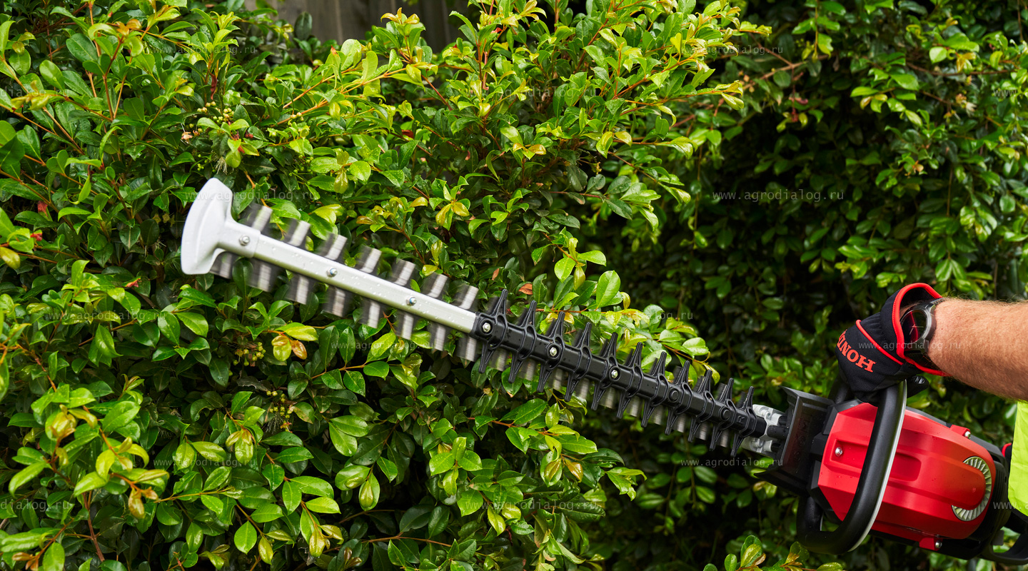 - Задняя рукоятка регулируется для облегчения подрезки боковых и верхней частей живой изгороди.