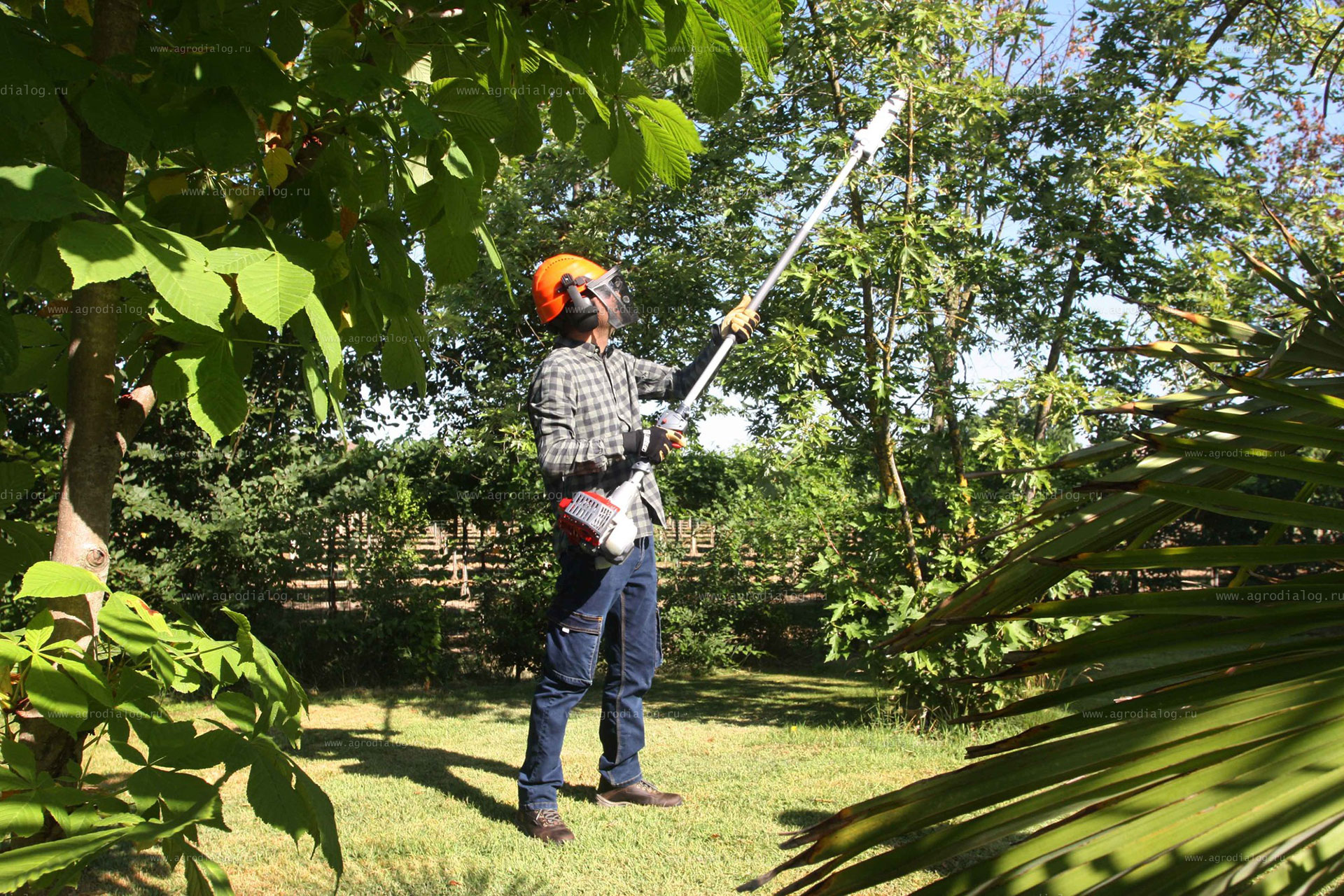 - Отсутствует необходимость использовать высокие садовые лестницы: стоять на земле на ногах гораздо безопаснее, чем на неустойчивой лестнице с работающим инструментом.