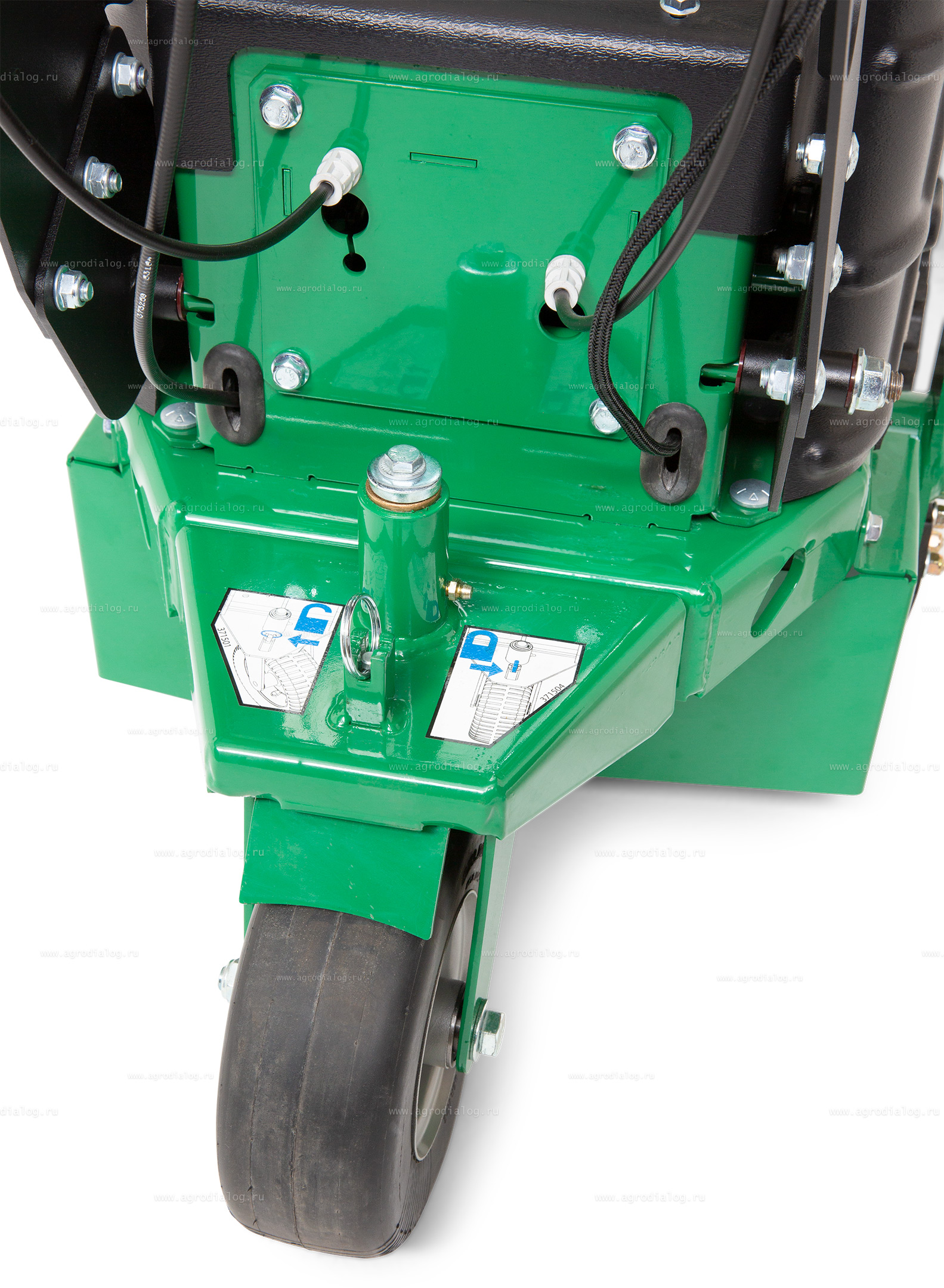 - Широкие пневматические колеса со специальным протектором не повреждают газон и обладают высокой проходимостью на участках со сложным рельефом.